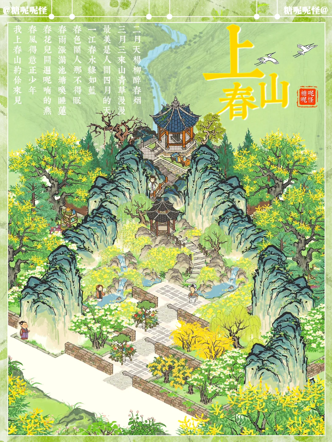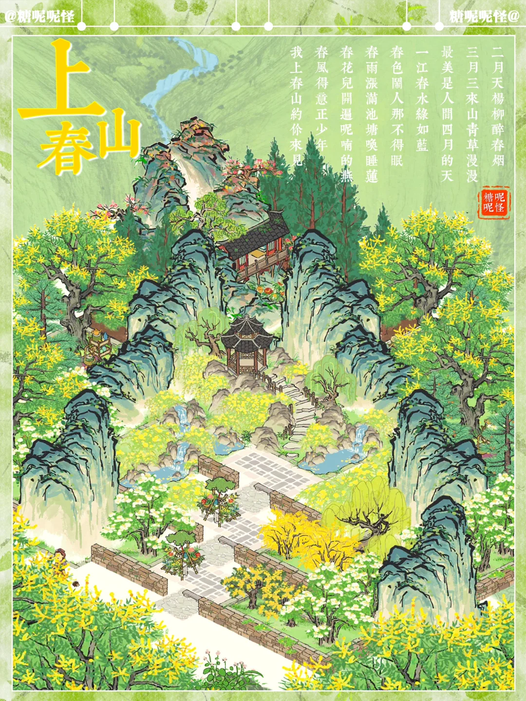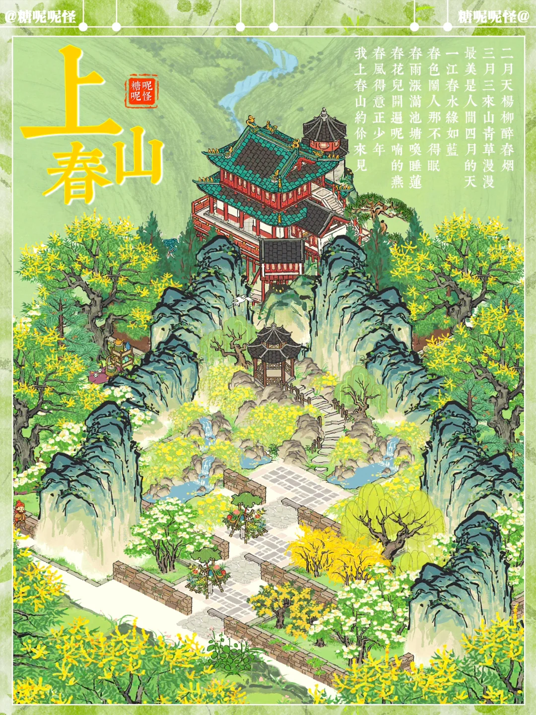 🌼迎春花系列建筑终于来啦 🌼上春山系列,你pick哪一个建筑的搭配 🌼建筑:春临山道|迎春山泉|迎春花丛|停云山|伏鹿山|不老山|有仙名山|叠云山|登高画碑|桐花深处