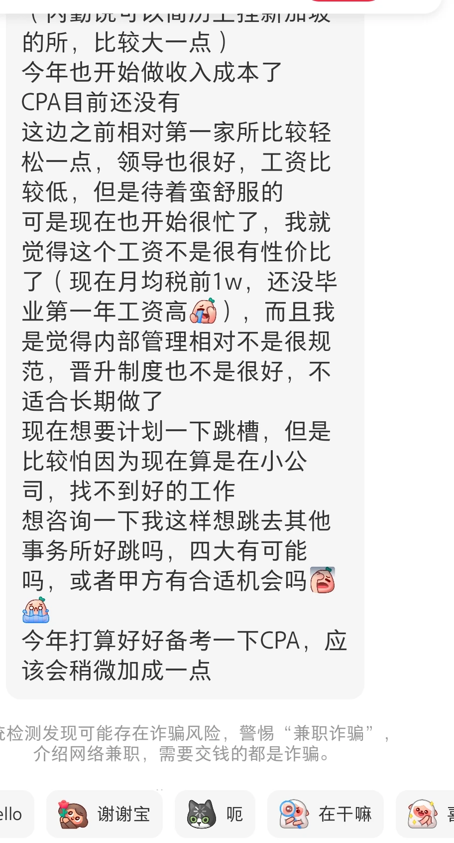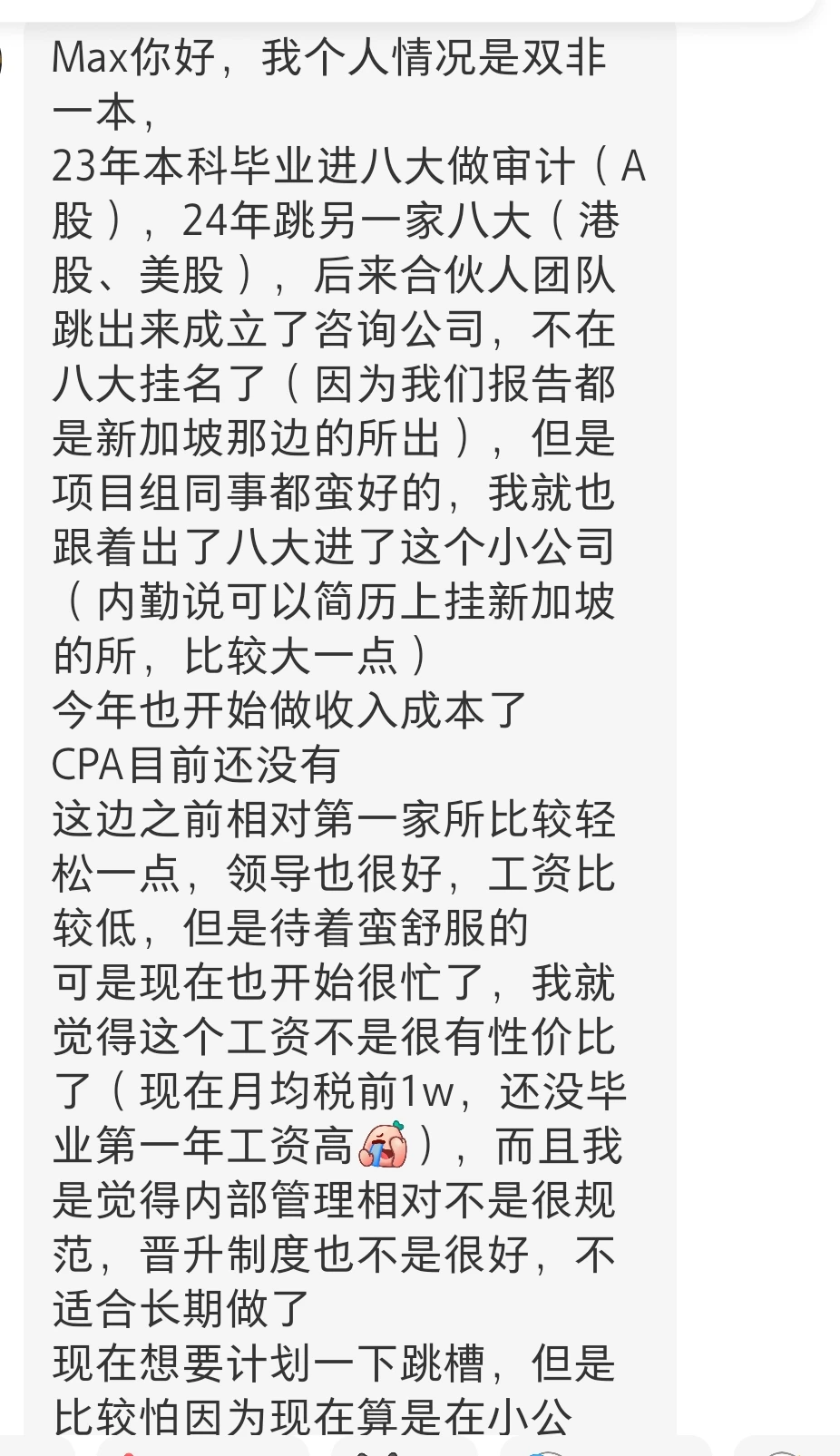 别说四大八大了,现在市面上很多华财的人找工作,高端岗位基本都一堆人盯着,我们公司就基本没有八大的同学,更别说小所了。 所以不是热爱审计,有的选的情况下,真别去小所。