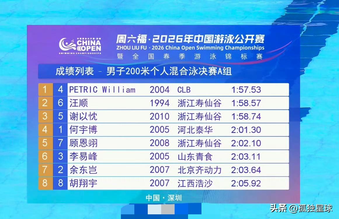 汪顺游不动的那一天:终于来了! 刚刚结束的 200 米混,汪顺尽力了,拿了亚军,丢了冠军。 2026年中国游泳公开赛男子 200混决赛,澳洲选手Petric以 1:57.53 夺冠了,汪顺 1:58.57 屈居亚军,队友谢以忱 1:58.74创造 pb 拿了季军。 肉眼可见,汪顺已经不再像以前,汪顺在前 2 个泳姿,保持着领先,但在最后的第四个泳姿,自由泳的冲刺阶段,已经明显落后了。 到了 32 岁的年纪,汪顺已经尽力了