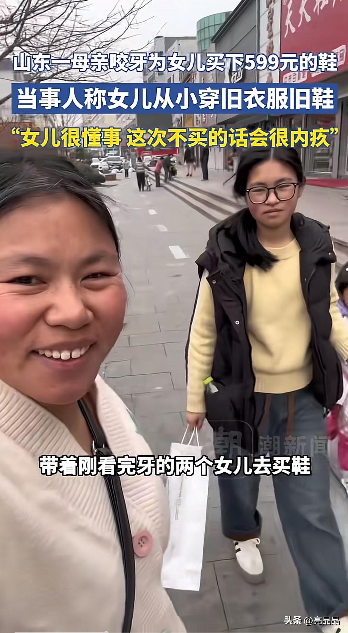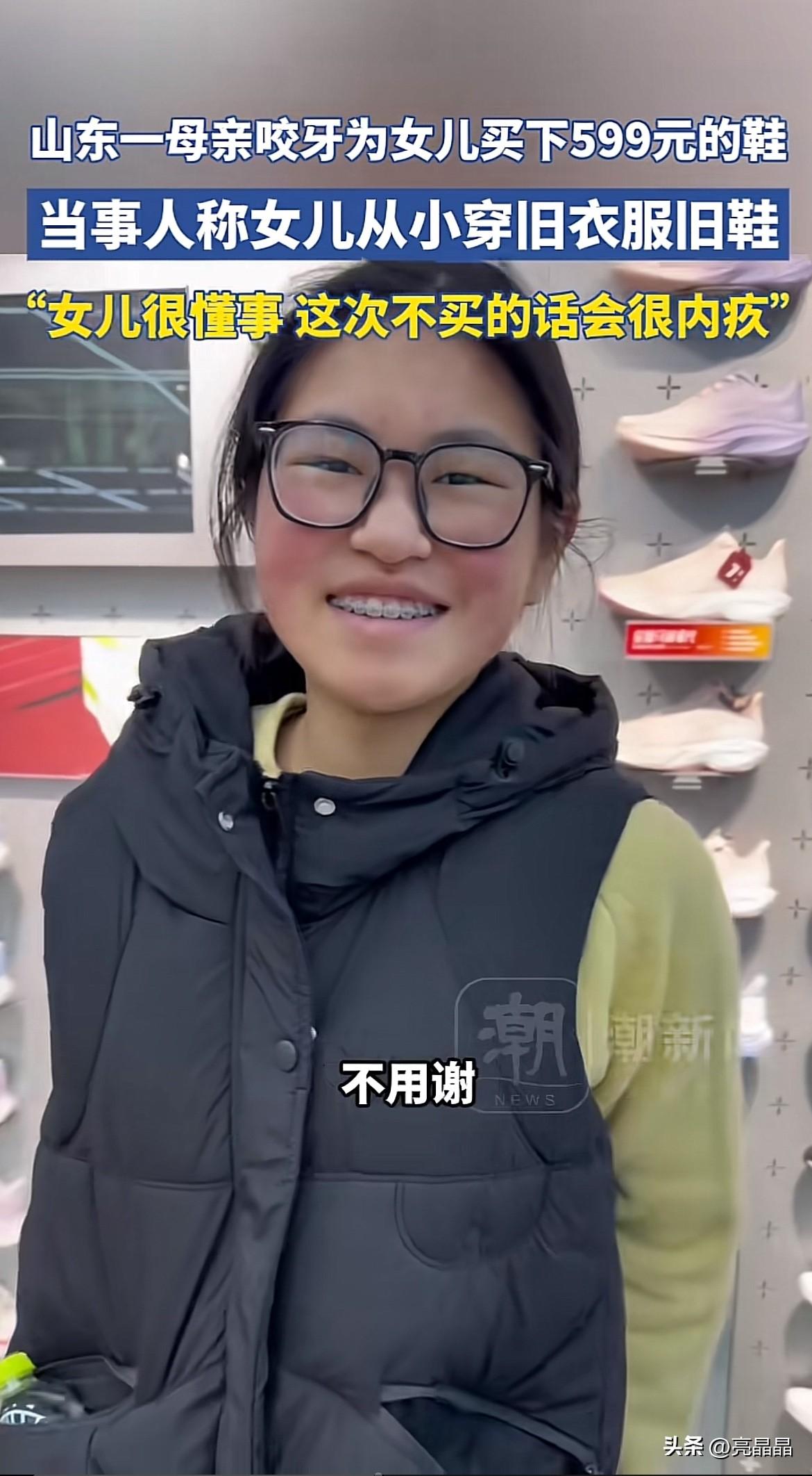 山东,一母亲带两个女儿去买鞋,大女儿看上一双599元的鞋,娘仨在店外犹豫半小时,最后母亲还是咬牙买下。 平时女儿很懂事听话,从小都是穿别人送的旧衣服、旧鞋,这次难得女儿看上这双鞋,不想让女儿失望。 虽然500多有点贵,够一家人一个星期的伙食费了,但如果不买,自己会很内疚,母亲咬咬牙,还是决定买给女儿。 大女儿笑开了花,高兴地跟妈妈说谢谢。母亲看着女儿的笑容,心里觉得这钱花得值。 网友热议普通家庭是否有必要买500多元鞋子,觉得如果家庭经济条件一般,就没必要花几百块买一双鞋,而且孩子长得快,一下子就合穿了。 还有网友支招,实体店看上了,可以到网上买,网购折扣更划算,算上凑单满减,还可以更便宜。 其实没有必不必要,女儿开心,童年的渴望得到了满足,那这钱就花得值了,妈妈不会因为没有买而留下一生的遗憾和内疚,女儿也因为妈妈的爱变得更懂得感恩。 这位妈妈看似冲动的消费,实则是对女儿满满的爱,更是犹豫半小时后,对生活的精打细算,虽然她们家庭可能不是很富裕,但一定很幸福。 相信会过日子的妈妈,带着懂事,懂得感恩的孩子,日子会越过越好。 父母倾尽全力为孩子提供想要的东西,这样无私的爱无须热议,一双鞋温暖了孩子整个童年,乃至一生,这钱花得可太值了! 你觉得有必要给孩子买这么贵的鞋吗?欢迎评论区留言。