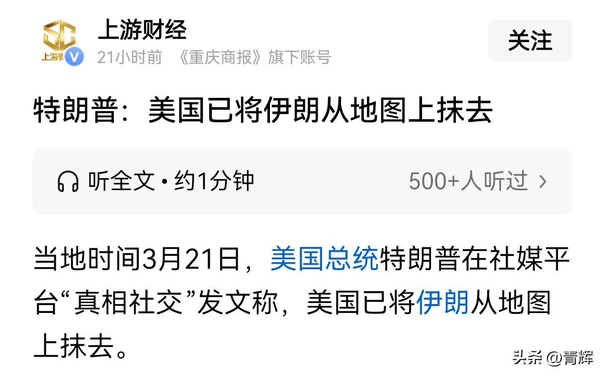 特朗普:伊朗已从地图上抹去!以色列:那每天是鬼在打我咯? 美国总统特朗普近期再次语出惊人,他声称伊朗已经从地图上被抹去了,还声称在过去几周的时间里,伊朗的高层已经被团灭,美军的计划已经达到。 这种言论离大谱,伊朗到现在为止仍然在坚持进行各种反击动作,尤其是以色列的核基地,目前已经被伊朗的导弹部分攻击。甚至连4000公里外的印度洋中部的英美军事基地也被伊朗的导弹照顾到了。在这种情况下,作为美国总统,就如此单方面的宣布美国的巨大胜利,这实属荒唐。 而在特朗普说出这番话之后,伊朗现任总统也马上进行了回应表态,说将伊朗从地图上抹去的幻想体现了面对一个创造历史的民族意志所流露出的绝望。威胁和恐怖只会进一步增强伊朗人的团结。霍尔木兹海峡对所有人开放,但不包括那些侵犯伊朗领土的人。 现在伊朗的态度很明确,要坚持全面和深入的战争,自己的高层确实已经被干掉了很多,但是到现在为止,伊朗所进行的反击确实是有一定的步骤和高层指挥的。这就证明了,在美国和以色列发动的闪电突袭面前,伊朗并没有像委内瑞拉那样迅速被干掉,反而开始呈现出“越来越稳定”的反击姿态。这种情况如果持续进行下去,以色列和美国都会有大麻烦。以色列没有什么国土纵深,随着防御力的下降,损失将会越来越大。美国也必然要投入更多的成本和精力想要获得胜利,而这样一来,几乎会不可避免的被伊朗直接拖入战争的泥潭中不可自拔。