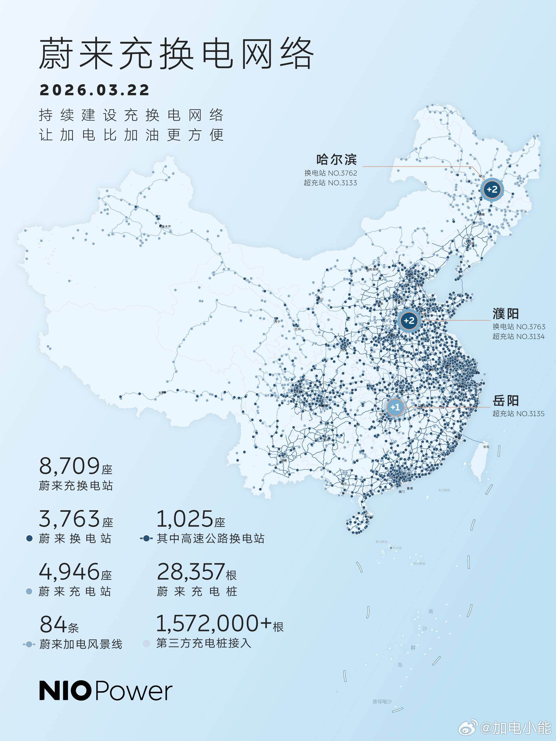 3月22日,NIO Power 5站上线NO.3762 蔚来换电站 | 哈尔滨尚志NO.3763 蔚来换电站 | 濮阳台前凤翔大道NO.3133 蔚来超充站 | 哈尔滨尚志NO.3134 蔚来超充站 | 濮阳台前凤翔大道NO.3135 蔚来超充站 | 岳阳平江商贸物流园持续布局-让加电比加油更方便