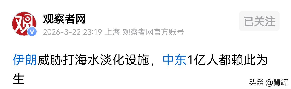 直接威胁1亿人!伊朗首次威胁打击海湾海水淡化设施 3月21号,在特朗普威胁伊朗之后伊朗方面迅速进行强硬回应,指出在接下来的军事反击中,有可能针对美国以及该地区的盟友,所有的能源信息技术和海水淡化设施进行攻击。 这番言论一出,马上引发整个海湾国家的高度关注,要知道海湾国家大部分的饮用水来自于海水淡化工程,全球十大海水淡化厂中有8座在阿拉伯半岛。如果伊朗对这些设施进行猛烈攻击的话,将会直接威胁海湾国家1亿人的生存危机。 这也是一直到现在为止,伊朗在对外的军事反击中并没有重点攻击海水淡化设施的核心原因。虽然现在伊朗面对的局势非常危急,但是如果大规模的反击包括以色列在内的海水淡化设施的话,就等同于当着全世界的面大规模的威胁各国的民生。这有可能让伊朗直接走向整个国际的对立面,到时候所面临的局势可能比现在要更加严峻。 不过现在伊朗既然已经发出了这种警告,就说明了美国和以色列对伊朗的攻击尤其是来自美国的威胁对于伊朗来说已经没有太多后路了。对于一个拥有远程导弹并且已经没有退路的中等强国来说,在最后时刻直接攻击海水淡化设施的可能性会越来越大。 顺便一说,以色列其实已经率先打击了伊朗的海水淡化设施,只不过伊朗对于海水淡化的依赖程度比较低,所以相对来说产生的影响也比较小。