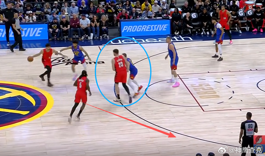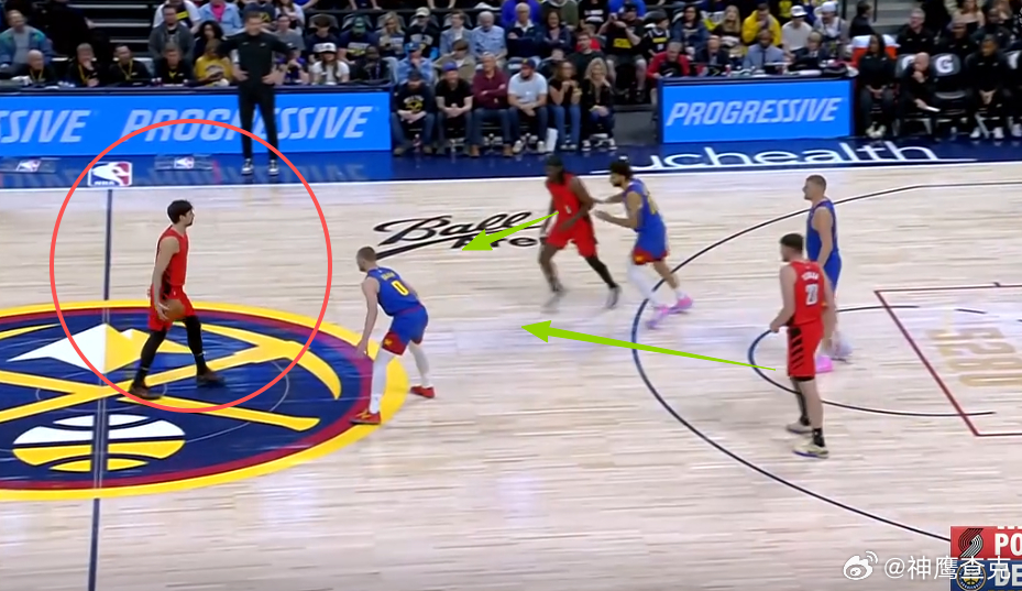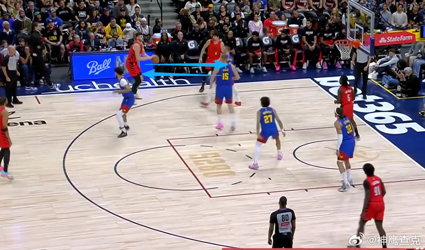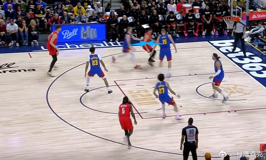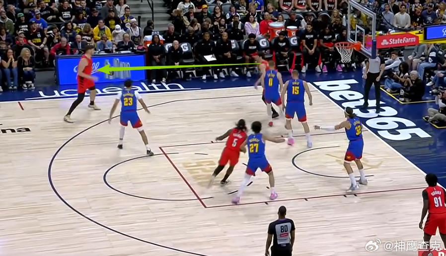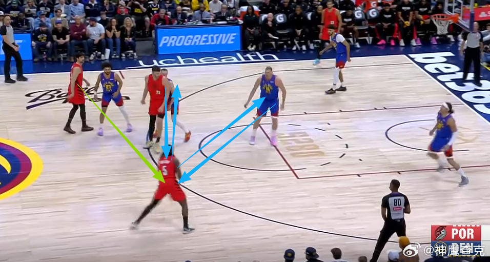 10 11 12 13 14阿夫迪亚上线持球在左侧45°与克林根发动边路挡拆配合,借助克林根扎实的掩护牢牢挂住追防的戈登后,阿夫迪亚挡拆行进间面对防挡拆守GAP位沉退/高位沉退的约基奇,推球变向走Z字形/蛇形行进至罚球线,吸引卡梅隆约翰逊弱侧回收站Nail位协防骚扰,随即跳起单手传球找到弱侧45°空位的卡马拉,助其三分命中。