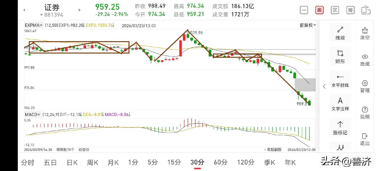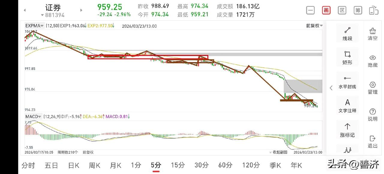 聊聊证券板块(2026.3.23) 今天证券板块跌幅比较大,最近两天跌幅累计差不多5%了,与预想的差不多,那么这里可以回补仓位吗?我认为还没到时候,预计还有2—3个点的跌幅,但这个跌幅不会一步到位,在小幅反弹后还会继续下行,所以还需要等待一二天时间,到时大机会就会来临。 1.从30分钟图一上看,第一个中枢的离开段比较强劲,在上一篇的文章中讲过,目前还没有第二个30分钟中枢出来,只有等它出来了,才有可能终结这段下跌,所以,这段下跌目前还没有完成,加仓的时机还没有到来,还需耐心等待。 2.从5分钟图二上看,目前构建了第二个5分钟中枢,并出现了趋势背驰,但上午下挫太强劲了,下午的反弹应该会很有限,并逐步会扩展成一个30分钟中枢,待构建完成后,还是会破新低继续下探,到时才会迎来绝佳的回补仓位机会,所以这里还是要管住手,耐心等待绝佳的机会出现。 3.市场虽然普跌,但还是有亮点的,其中光伏板块已提前进入上升周期,今天我已经配置了一部分,它有望率先发力,走出一波主升行情。