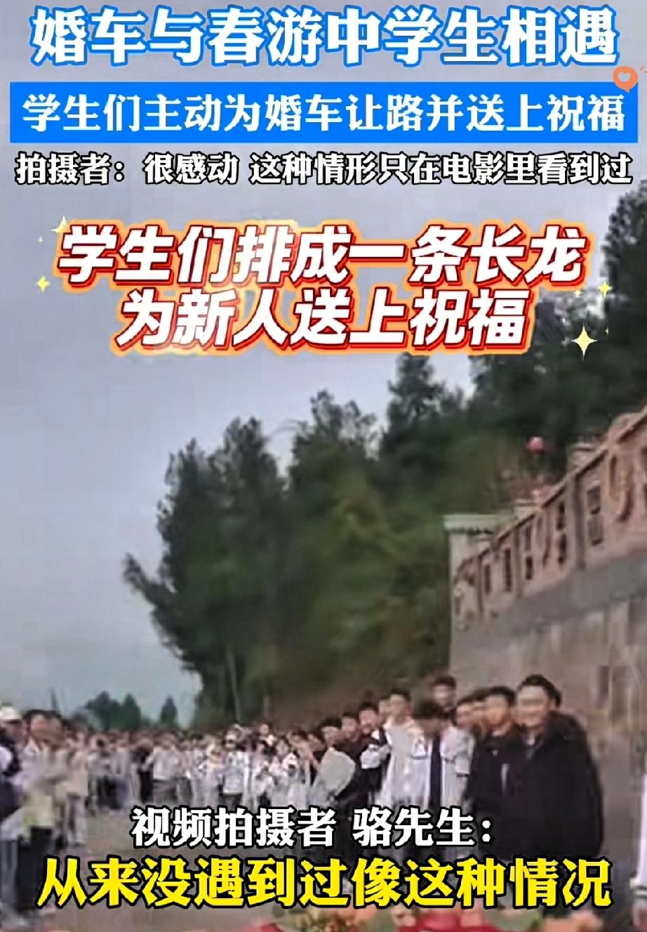 四川泸州这场婚礼的“顶级排面”,竟是一群陌生学生给的! 3月21号,新人接亲车队遇上春游的学生,窄窄的乡间小路本以为要堵车,孩子们却齐刷刷往路边靠,笑着挥手喊祝福。 接亲的骆先生当场激动到掉泪,说从没见过这么暖心的场面。网友都说这是“百子送福”,花钱都买不来的好兆头。 新人遗憾喜糖不够分,婚礼一结束就想着给孩子们补发。 真正的教养从不是刻意表演,而是刻在骨子里的善意。 孩子们让出的不只是路面,更是对他人幸福的真诚守护,这种不加修饰的温暖,比任何豪车排场都珍贵。 生活里的美好从不是计划好的,而是这些不期而遇的真诚。 你见过哪些陌生人之间的暖心瞬间?