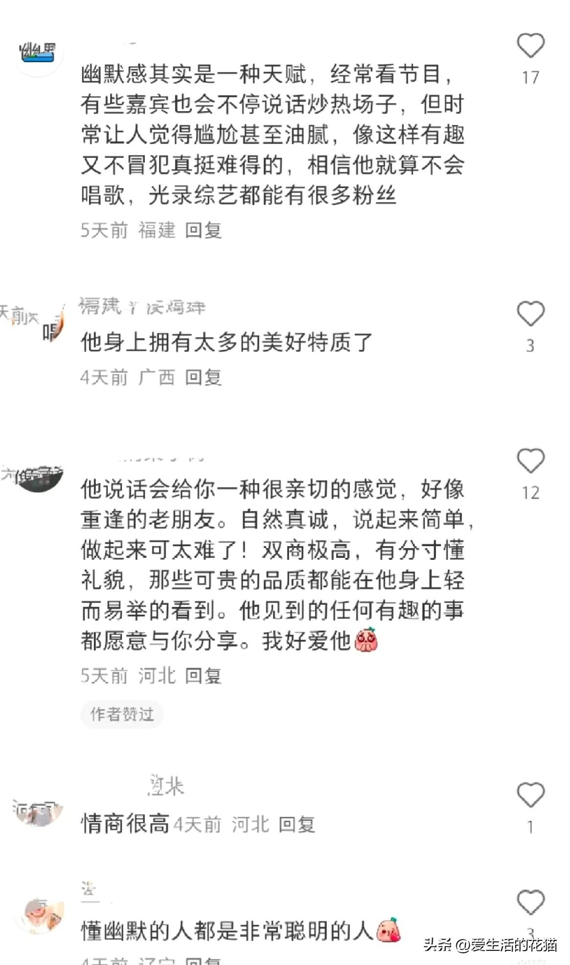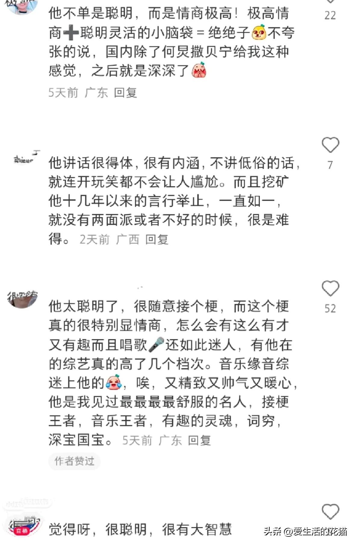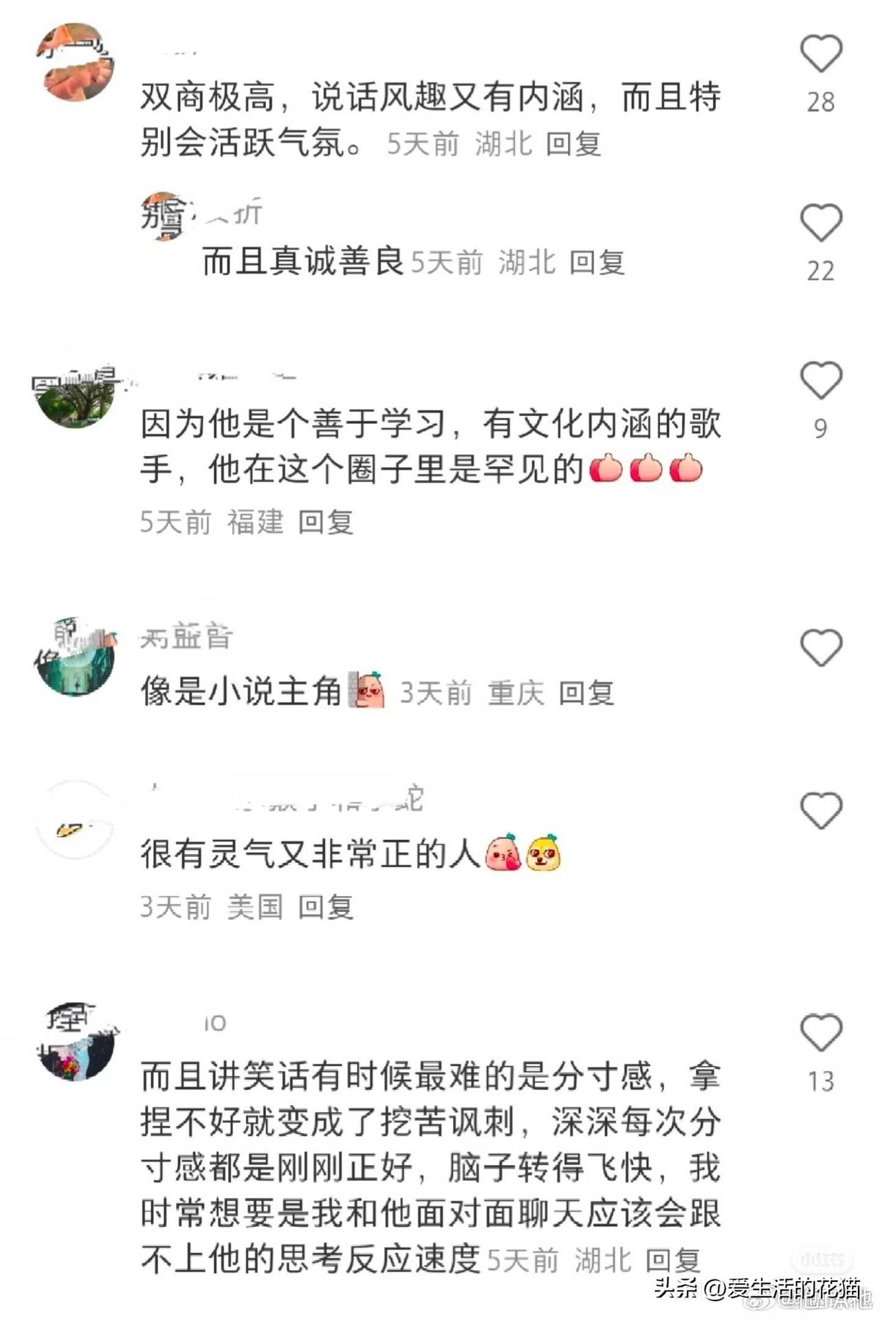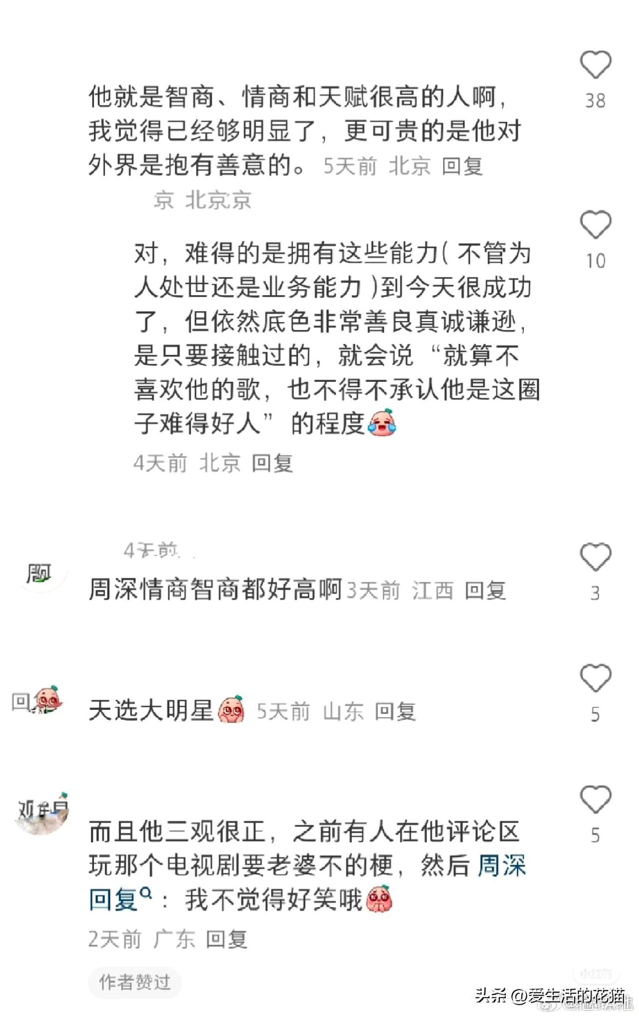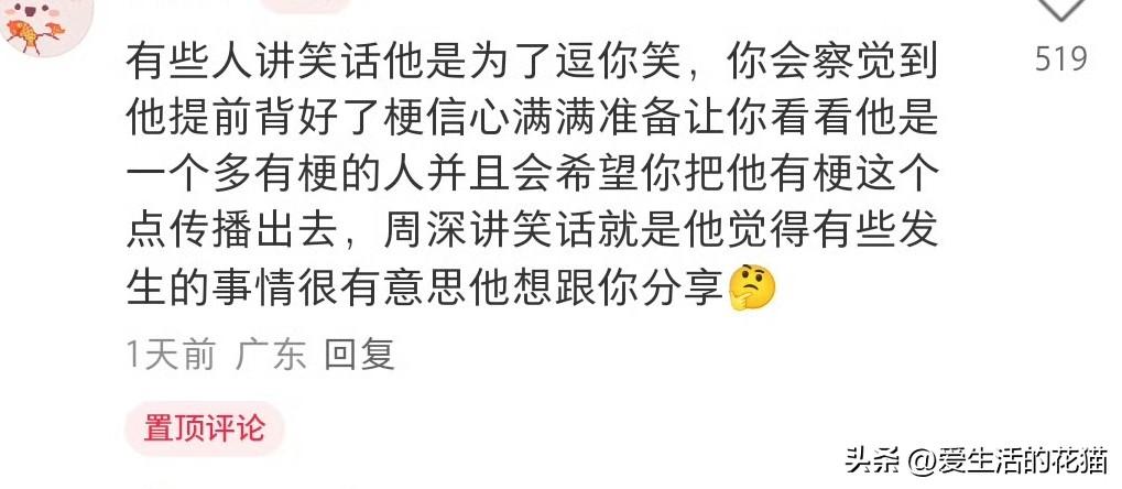 确实是,你看下面评论区,每一面都魅力十足,这谁能不爱呢! 深深吧,你越品越觉得老天爷偏心,聪明幽默全让他一个人占了哈! 聪明幽默又有涵养,逗你笑引你思考,却从不讲低俗的话,双商高又没有压迫感,待人接物舒服的像晒太阳。周深,就这么完美!