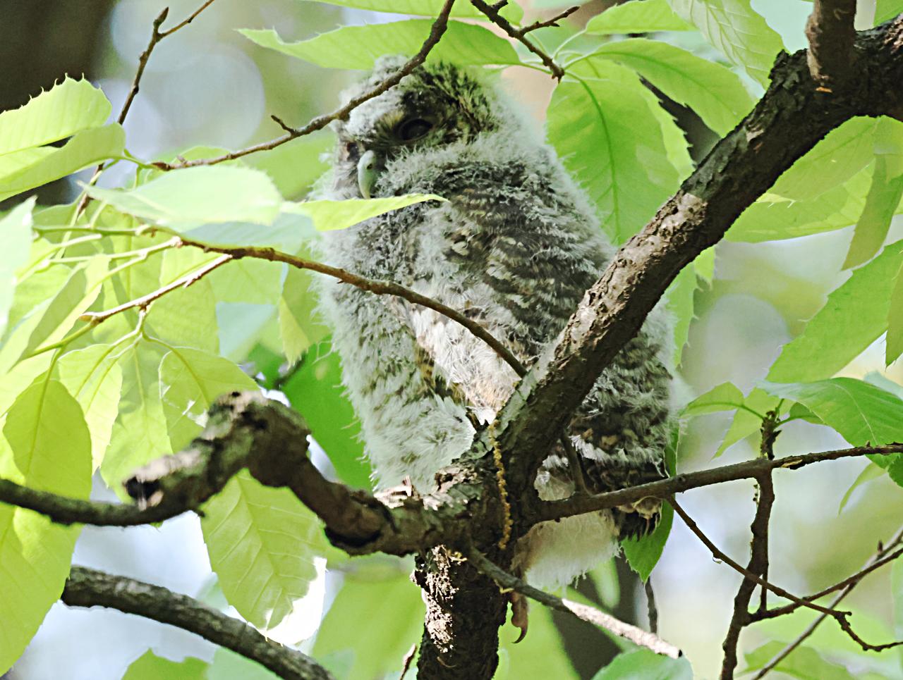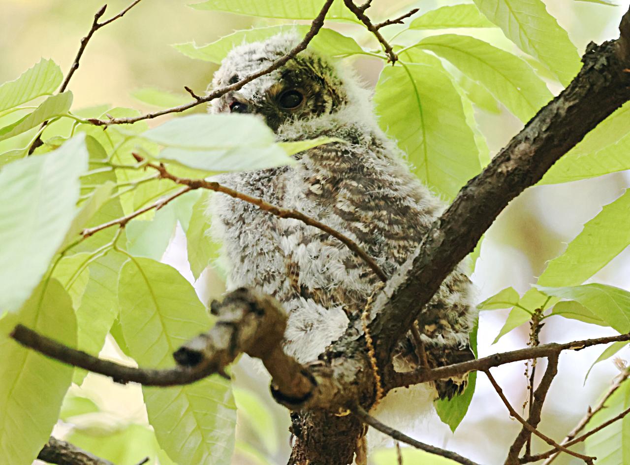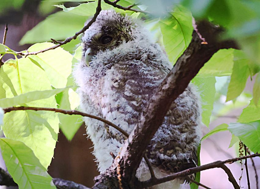 看,鸮宝宝出洞了! 这几天,各路鸟友都在赶去昆明黑龙潭公园拍灰林鸮幼鸟。前几天它还躲在大树洞里。 今天上午,我也去凑热闹,拍到一只鸮宝躲在林中一些树叶下,有树枝遮挡且逆光,浑身毛绒绒的,挺可爱。