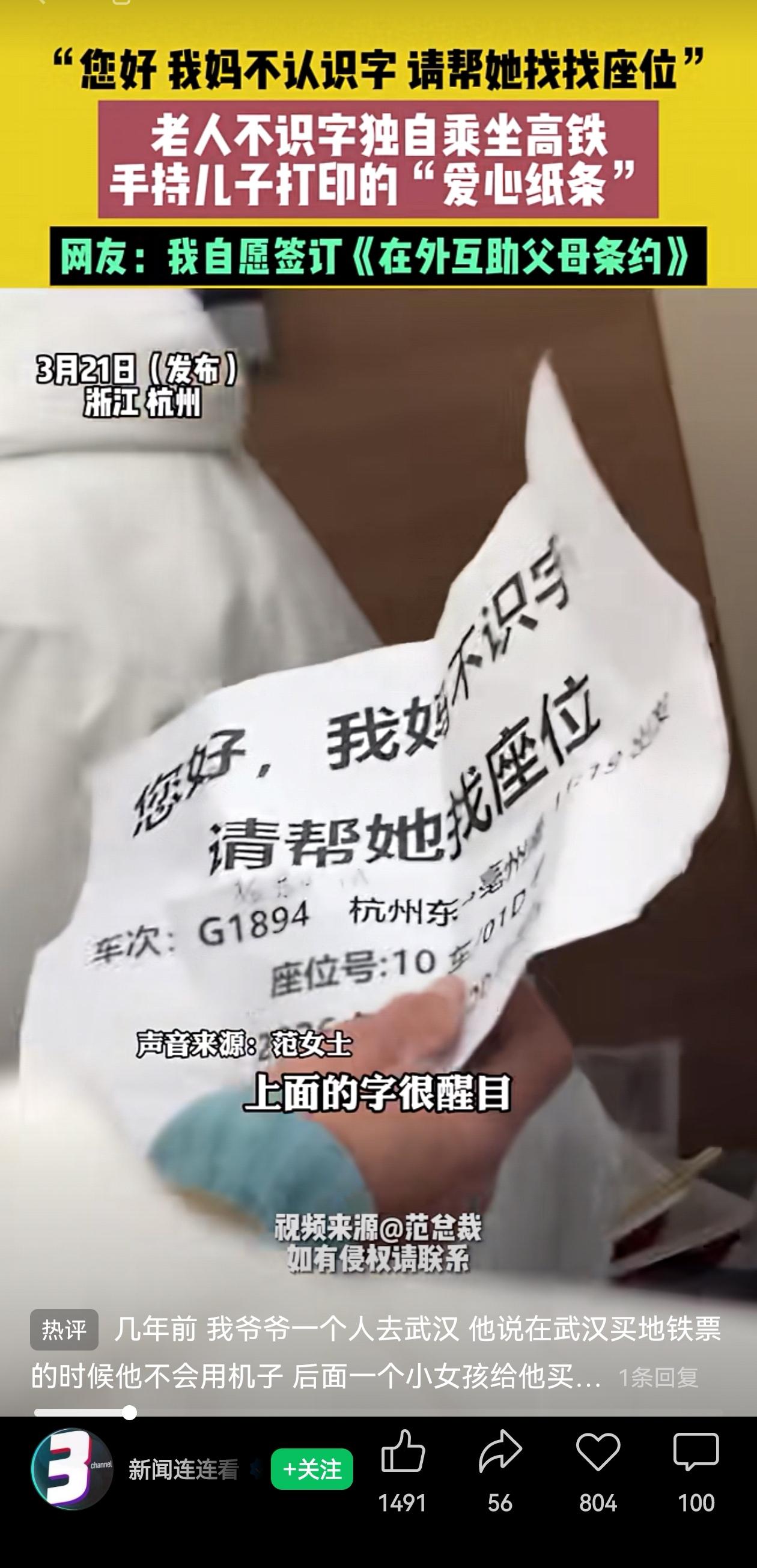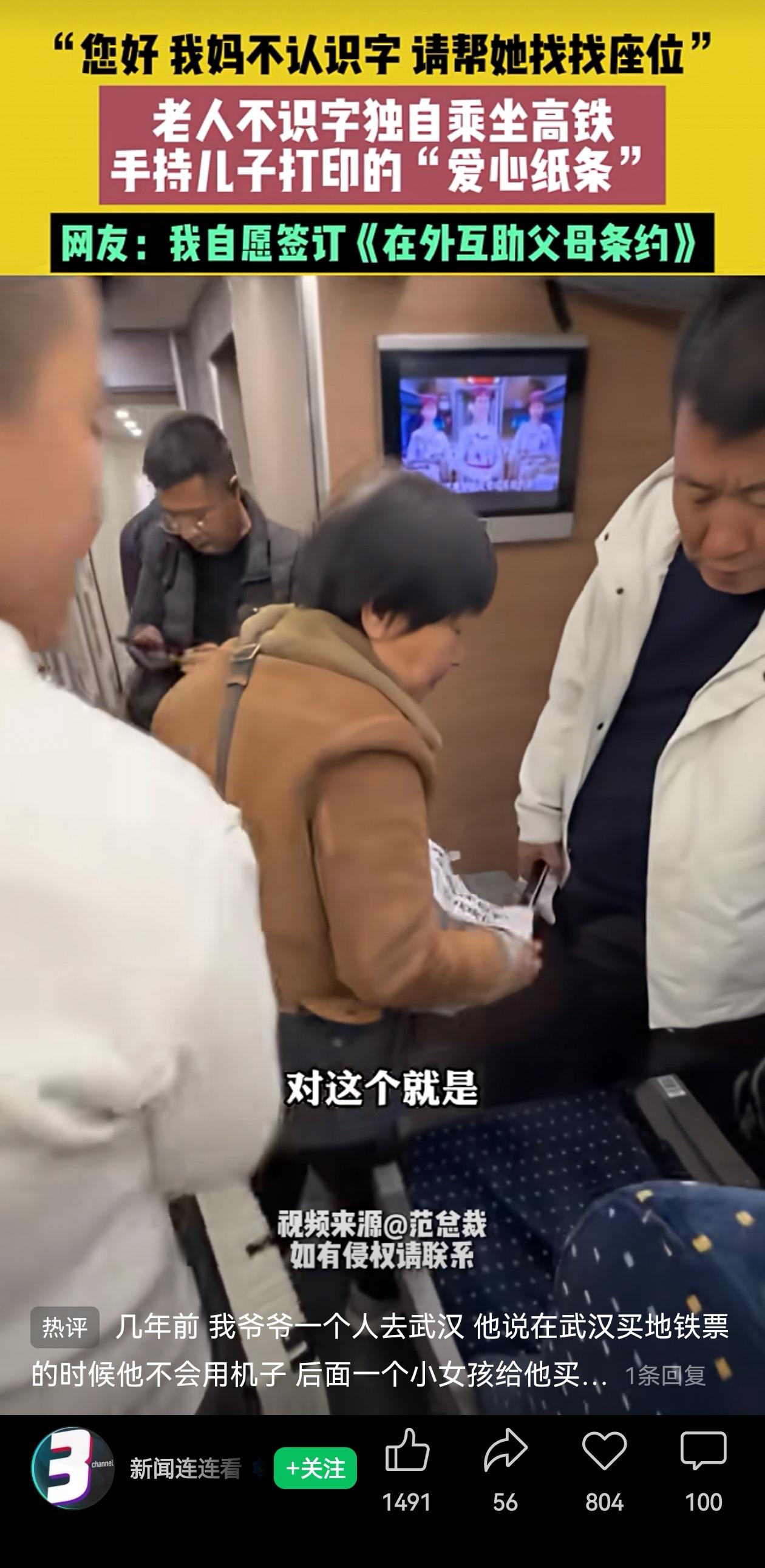 浙江杭州的一位阿姨独自出门坐高铁,儿子知道妈妈不认识字,有可能记不住乘车的具体信息?可能调不出手机上的乘车信息?着急间会不好意思开口求助? 想到妈妈可能面临的窘境,他把求助信息替妈妈写好,最有心的是,字号放大,占满了一张A4纸,生怕别人看不清。 他没赌妈妈能自己搞定,而是赌这世上总有人愿意搭把手。 老人攥着纸条站在车厢里,手足无措,但那张纸就是她的底气。旁边乘客一看就明白了,没多问,直接帮忙把妈妈带到了座位。 结果和儿子的预期一样,有热心人帮助妈妈顺利找到了座位。 全程没有大张旗鼓的感人场面,就是一个儿子把担心藏在细节里,一个陌生人把善意接了过来。 很多人说孝顺是陪伴,但现实是儿女常常陪不了。能想得这么细,把妈妈出行的每一步都提前铺好,这本身就很用心了。 虽然就是这么件小事,但是一张纸条,几个大字,把儿子的担心体现的明明白白! 一边是担心父母出门的孩子,一边是不想给孩子添麻烦的父母们。儿子把牵挂写进纸条里,陌生人把善意接了过来! 儿子知道妈妈不认字,就把求助的话打印得大大的,塞进她手里。陌生人看到纸条,没多问,直接领着找座位,一路照看着,最动人的事情就这么简单。 这世上的温柔,大多都藏在这些小事里,藏在提前想到的细节里,藏在毫不犹豫的举手之劳里。 安全出门,儿子替你考虑周全,有路人愿意搭把手,是不是就完全够了呢? 信息来源:新闻连连看