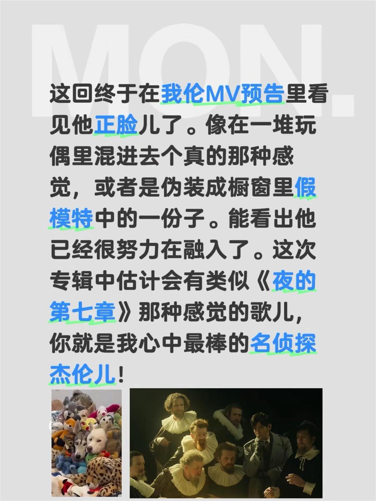 这回终于在我伦MV预告里看见他正脸儿了!像在一堆玩偶里混进去个真的那种感觉,或者是伪装成橱窗里假模特中的一份子。能看出他已经很努力在融入了。这次专辑中估计会有类似《夜的第七章》那种感觉的歌儿,你就是我心中最棒的名侦探杰伦儿!周杰伦 周杰伦新专辑