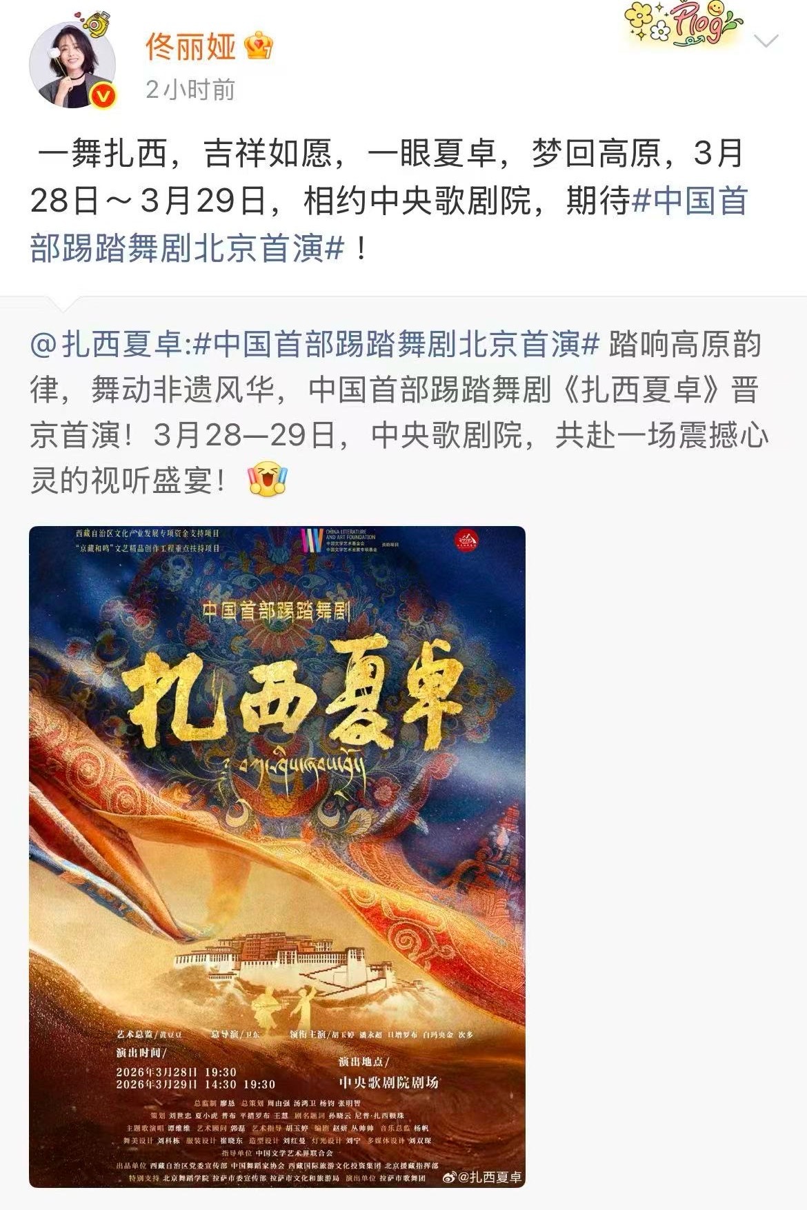 佟丽娅给中国首部踢踏舞打call 中国首部踢踏舞剧北京首演《扎西夏卓》北京首演震撼来袭!以踢踏舞演绎非遗故事,佟丽娅暖心打call,藏地风情与灵动舞步交融,共赏守望相助的动人篇章✨