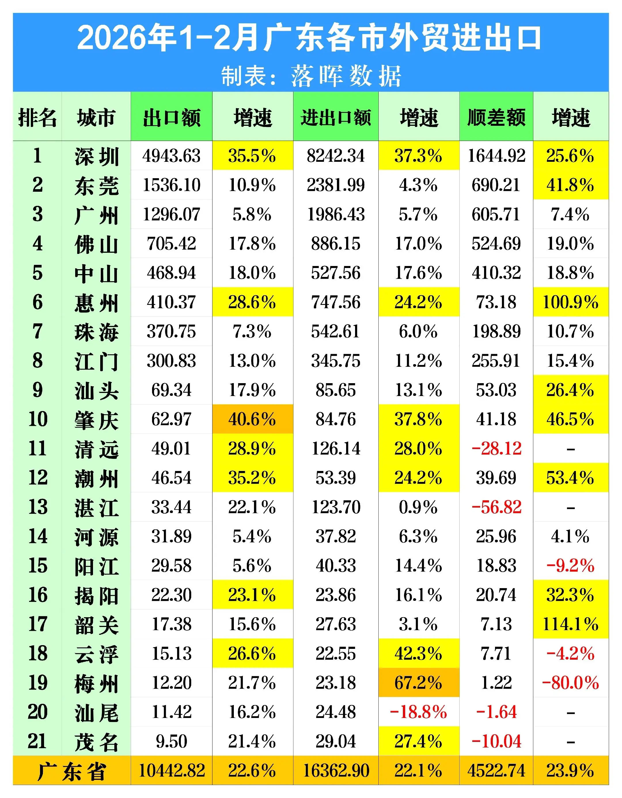 2026年1-2月广东各市外贸进出口:21市出口均实现增长,汕尾进出口唯一负增长