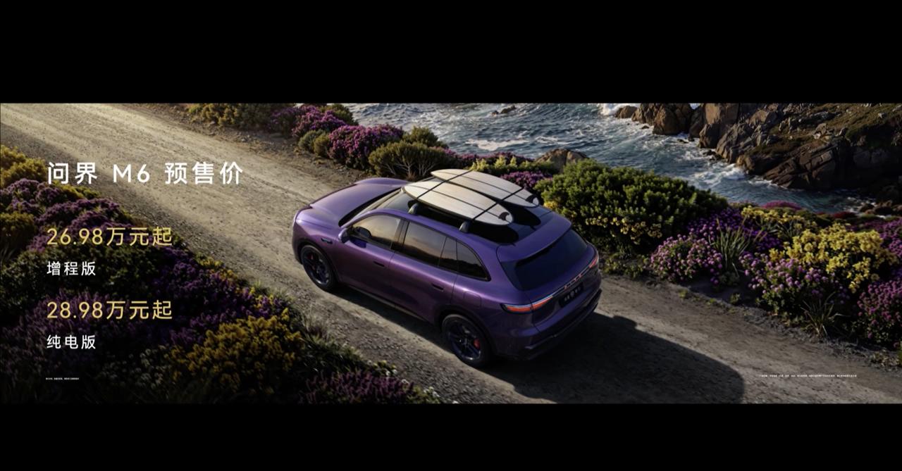 问界M6开启预售,增程26.98万起,纯电28.98万起,下订2000元抵5000元,免费冷暖箱+电吸门。CLTC纯电续航760km,增程综合续航超1400km,四驱版4.8秒破百,全系800V,896 线激光雷达,华为全家桶,途灵平台、巨鲸电池全给到。HUD抬显,四维随动中控屏,副驾灵感橱窗,主打大五座宽适空间,多套外观内饰配色,推荐紫慕白双拼,质感拉满的组合。大气场,大舒适,大脑洞,大视野,这宣传语有意思,至此问界M56789齐活了,大家说这价格能打吗?【来自懂车帝车友圈】
