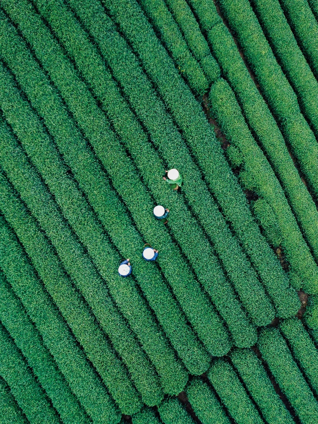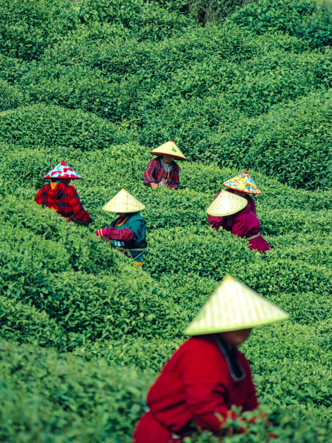 在满眼翠绿的茶园里穿梭忙碌