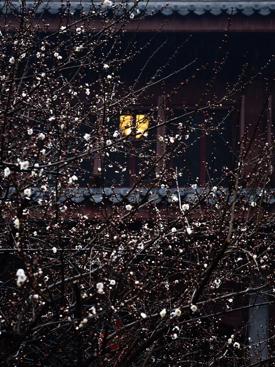 ❷院内有几株梅花开了,以建筑为背景拍特写,梅花也显得特别有佛性。