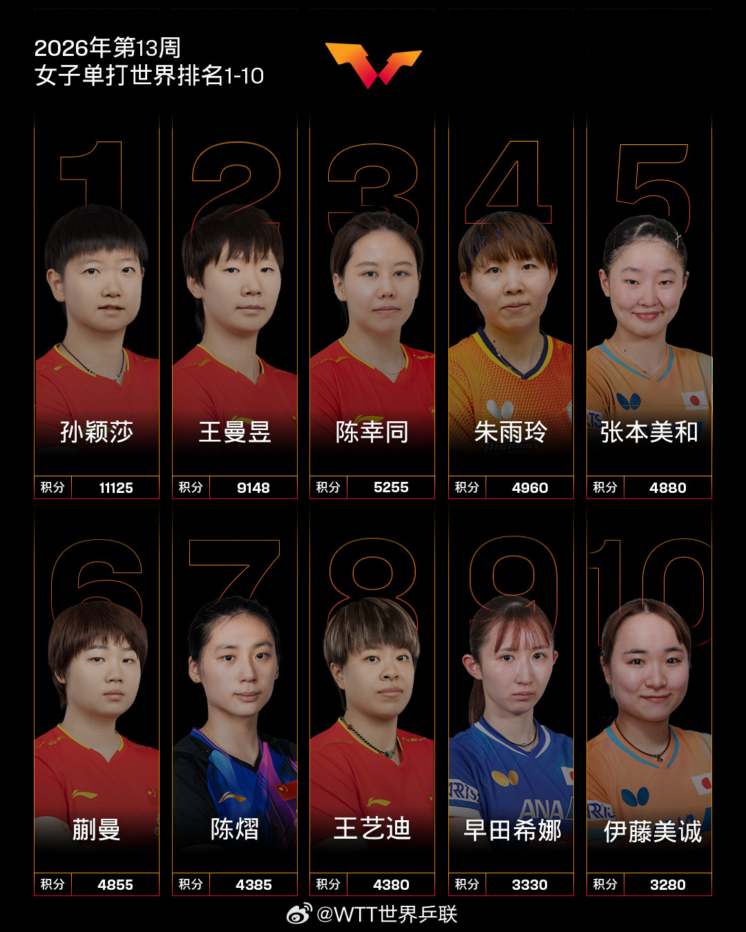 国际乒联第13周世界排名乒乓球