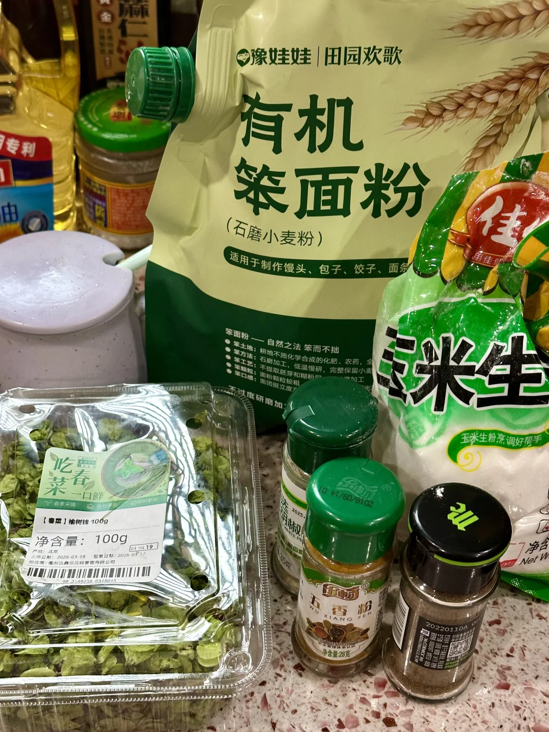 榆树钱100g,中筋面粉80g,玉米淀粉30g,盐3g,白胡椒粉适量,清水适量。
