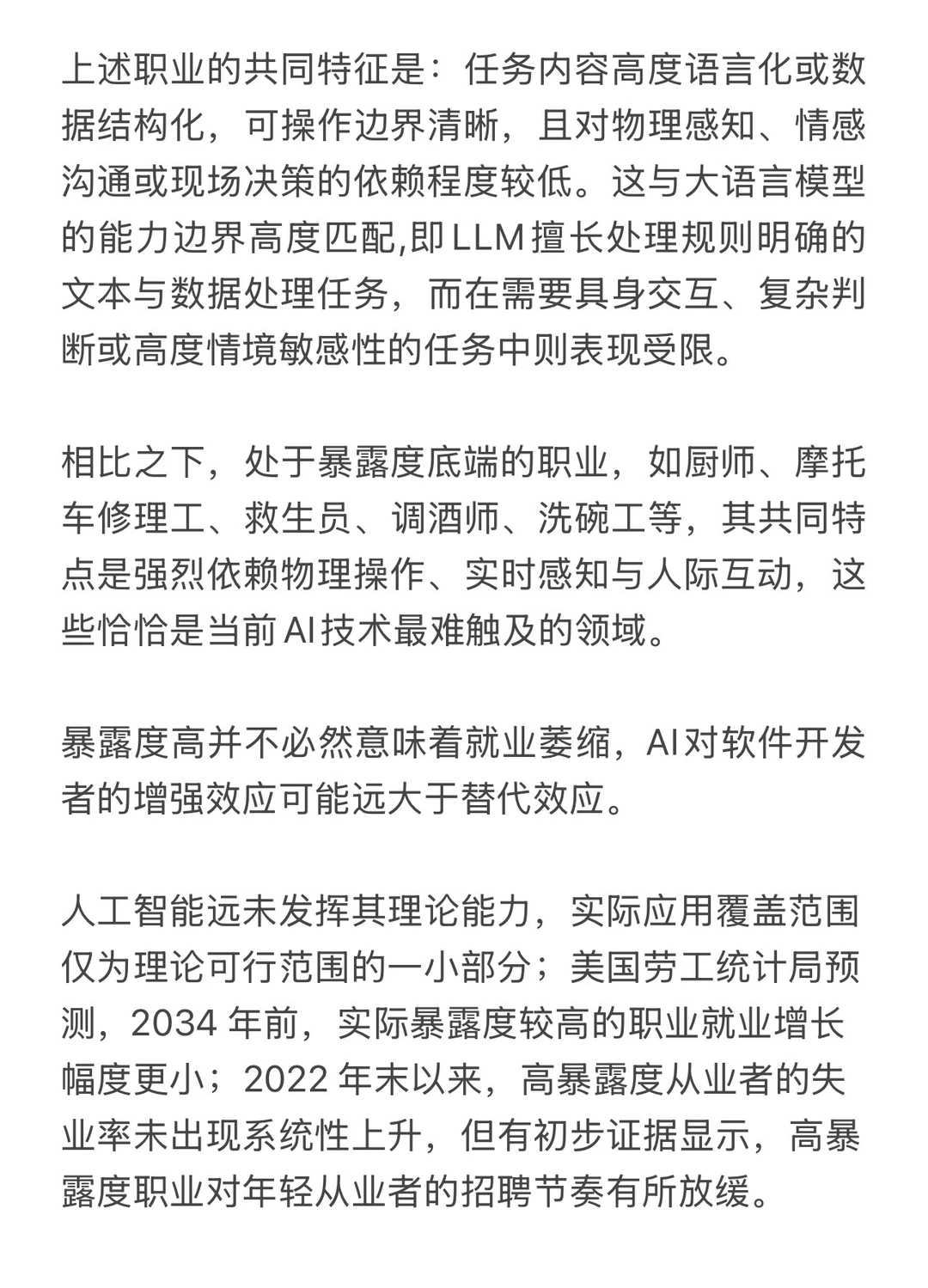 处于暴露度底端的职业,如厨师、摩托车修理工、救生员、调酒师、洗碗工等,其共同特点是强烈依赖物理操作、实时感知与人际互动,这些恰恰是当前AI技术最难触及的领域。
