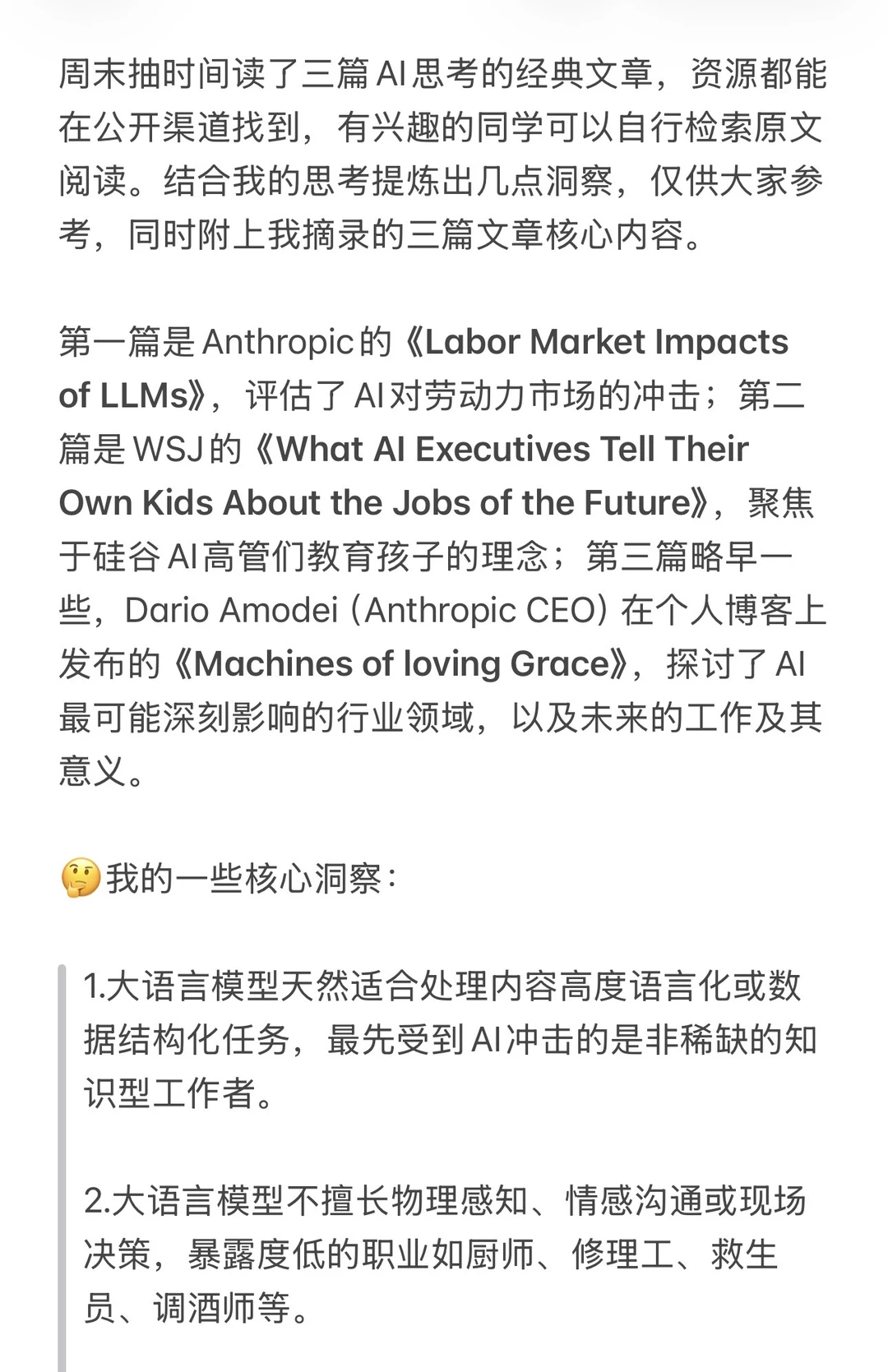 周末抽时间读了三篇AI思考的经典文章,资源都能在公开渠道找到,有兴趣的同学可以自行检索原文阅读。结合我的思考提炼出几点洞察,仅供大家参考,同时附上我摘录的三篇文章核心内容,完整内容如图。