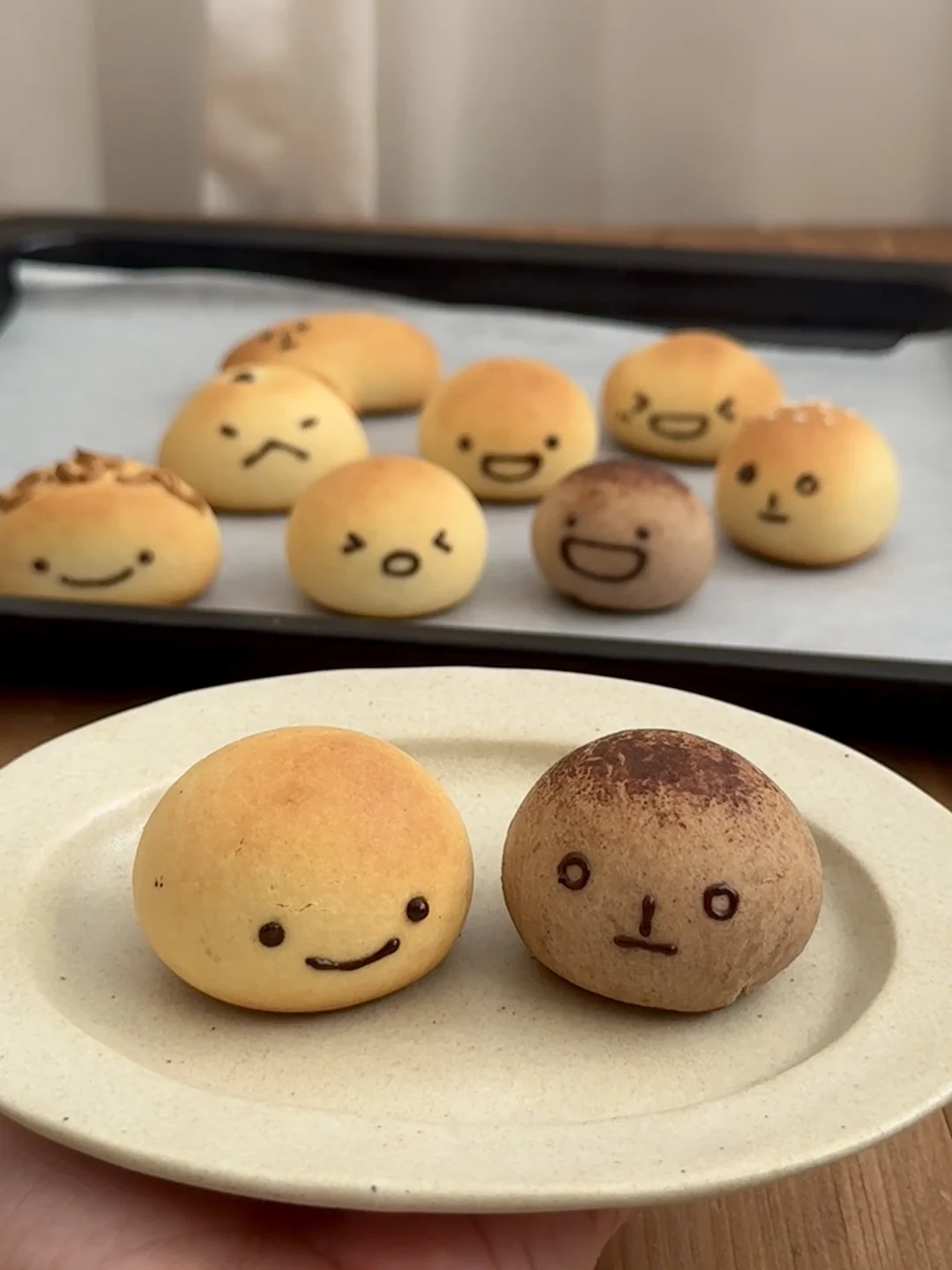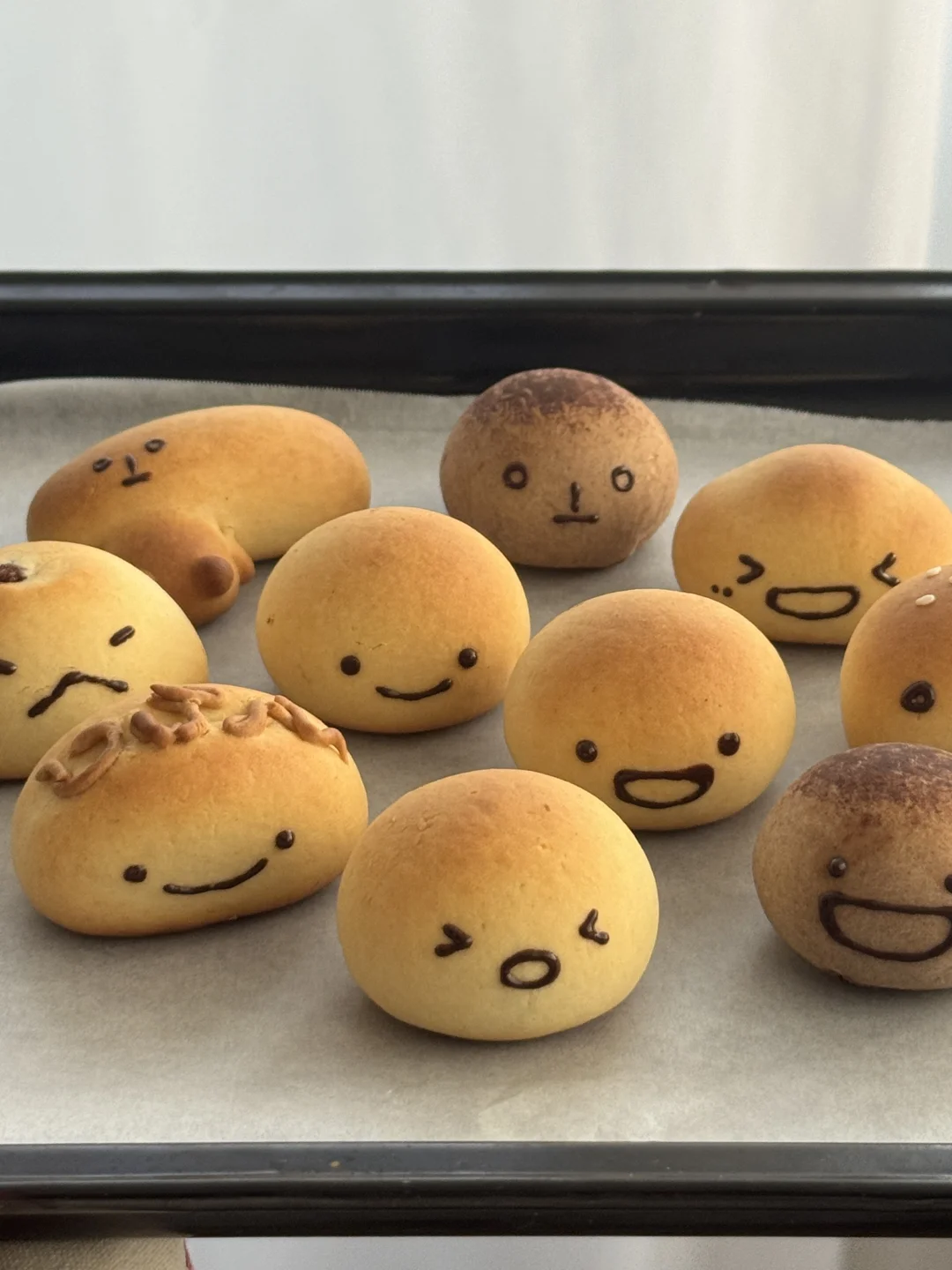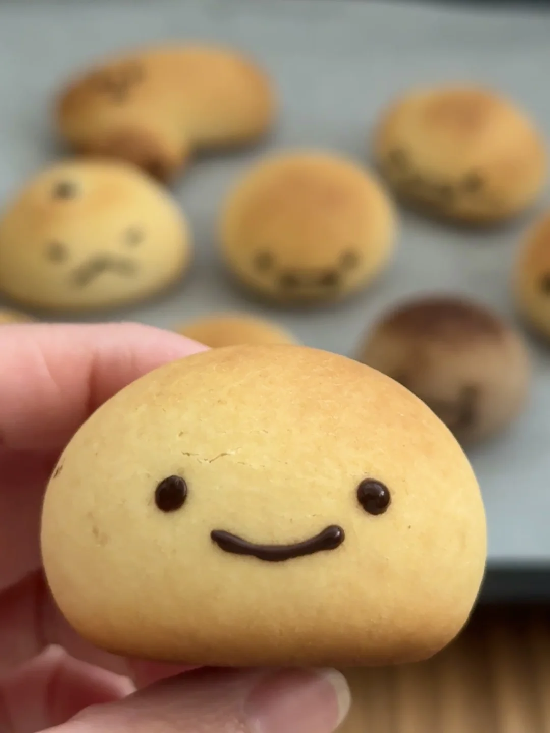 烤了一盘酥脆香甜的烤焦面包烧果子~ - 材料: 炼乳100g、蛋黄1个、低筋面粉120g、泡打粉2g、红豆沙10g/个 材料: 1️⃣炼乳和蛋黄加入到料理盆里搅拌均匀,过筛加入低筋面粉和泡打粉,用刮刀混合均匀后,上手混合成团 2️⃣面团分成25/个,包入10g的红豆沙,收口收紧 4️⃣烤箱170度预热后烤15分钟分钟,后转180度烤5分钟使得顶部上色,烤好的烧果子用巧克力酱画上表情就好了