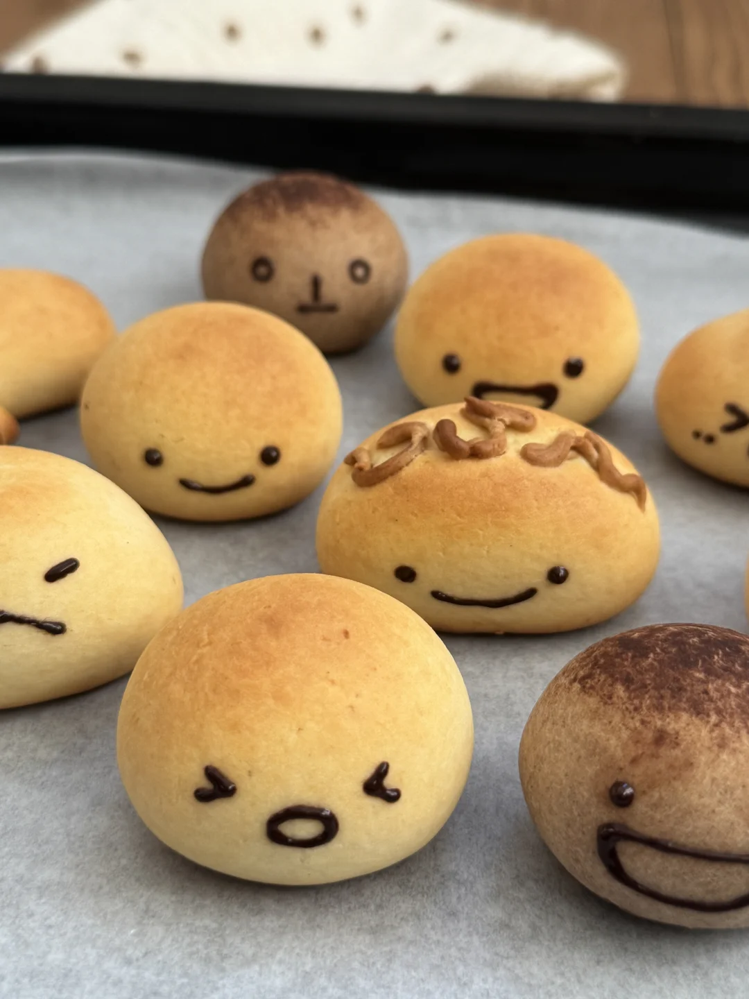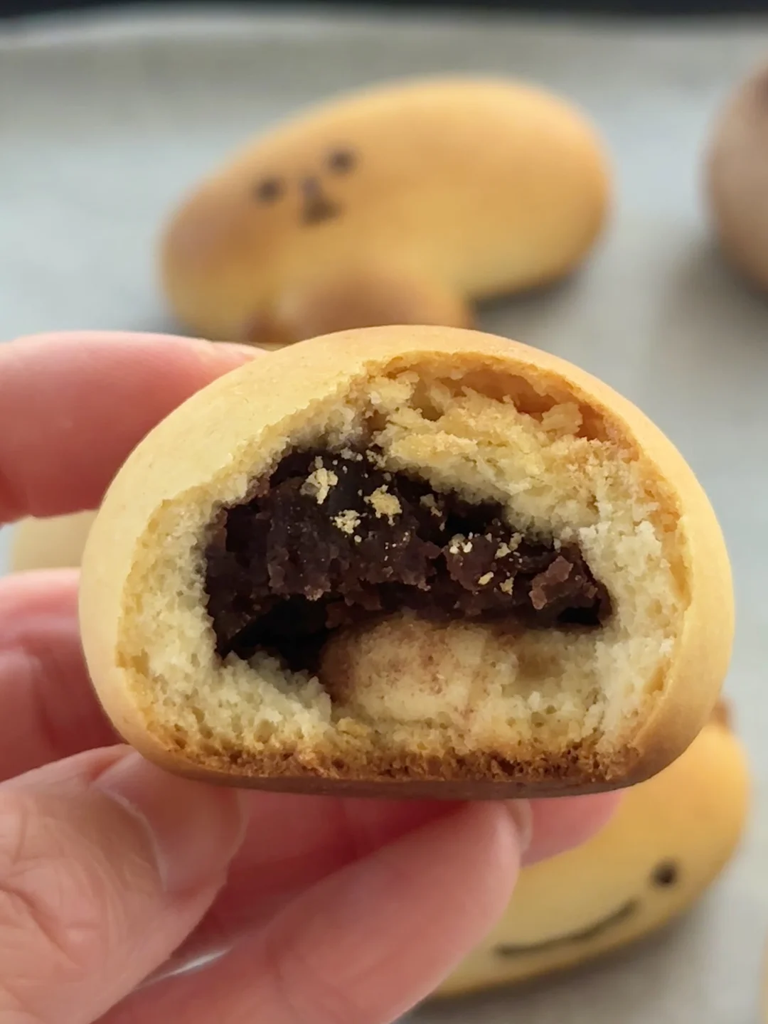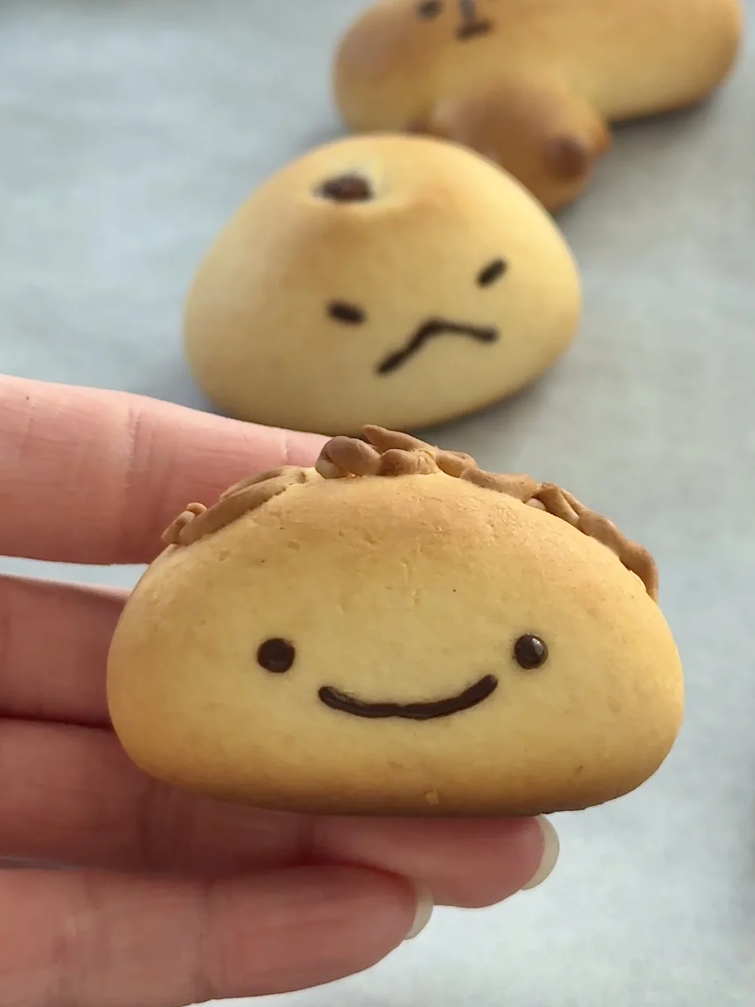 烤了一盘酥脆香甜的烤焦面包烧果子~ - 材料: 炼乳100g、蛋黄1个、低筋面粉120g、泡打粉2g、红豆沙10g/个 材料: 1️⃣炼乳和蛋黄加入到料理盆里搅拌均匀,过筛加入低筋面粉和泡打粉,用刮刀混合均匀后,上手混合成团 2️⃣面团分成25/个,包入10g的红豆沙,收口收紧 4️⃣烤箱170度预热后烤15分钟分钟,后转180度烤5分钟使得顶部上色,烤好的烧果子用巧克力酱画上表情就好了