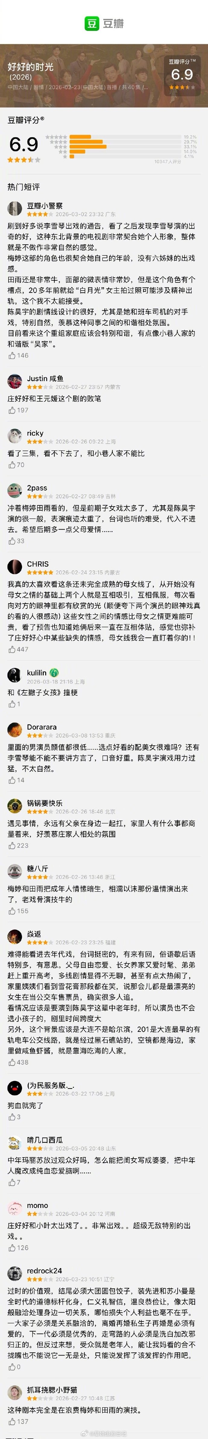 梅婷、田雨、陈昊宇《好好的时光》豆瓣开分6.9分谭松韵《我的山与海》豆瓣开分6.6分