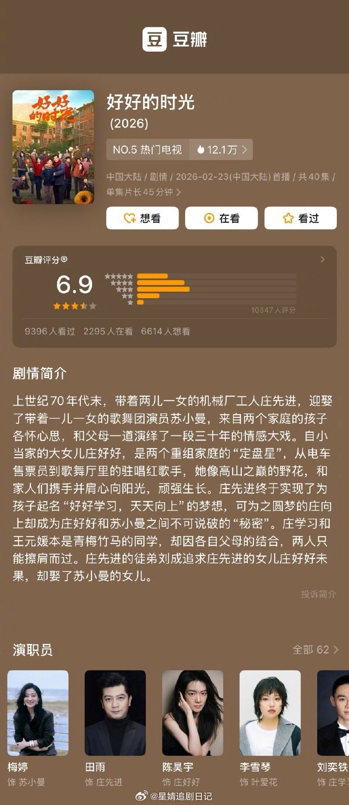 梅婷、田雨、陈昊宇《好好的时光》豆瓣开分6.9分谭松韵《我的山与海》豆瓣开分6.