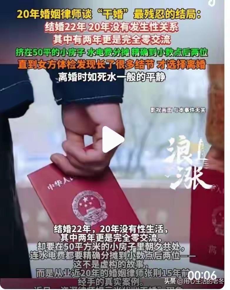 水电分摊记得有读者向社会学家提了一个问题:婚姻是什么?这位学者没有任何掩饰回答:合伙开公司。当时对这位社会学家的说法不太理解,感觉把人类千百年来盛赞无比的美好爱情和婚姻描绘成开一个公司,离题万里不说,更为不悦的是既然是开公司,人类婚姻的目的究竟何在?不开这个公司不结婚不行吗?时隔多年,当你真正进入婚姻道路,慢慢也就理解了这位学者的高见。如果把这句话移至当代婚姻环境中,可谓一语中的。 上海女子与丈夫结婚22年,20年没有性生活,虽同住一套50平米的屋檐,没有烟火气。各过各的零交流,日常开销分摊精确到小数点,32.57元的水电费各出16.28元,生活极度寡淡却一直无人提离婚。最压抑的两年里,家里安静得只剩下呼吸声。女子一度以为,婚姻本就该如此,忍一忍,一辈子也就过去了。她默默承受着日复一日的压抑,身体频繁不适,到医院体检时报告单上的甲状腺多处结节结果让她瞬间僵住,此时她才猛然清醒:自己竟在这段毫无温度的婚姻里煎熬了二十二年。 相信现实生活中没有温度的家庭很多很多,原因多种多样,千差万别,为一张纸捆绑、一个承诺困扰牺牲者大有人在。 不像时下的年轻人,能过则过,不能过离婚。虽不赞成,但放下铠甲,何尝不是一种勇敢和幸福!!!