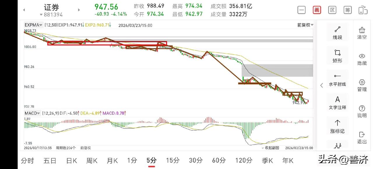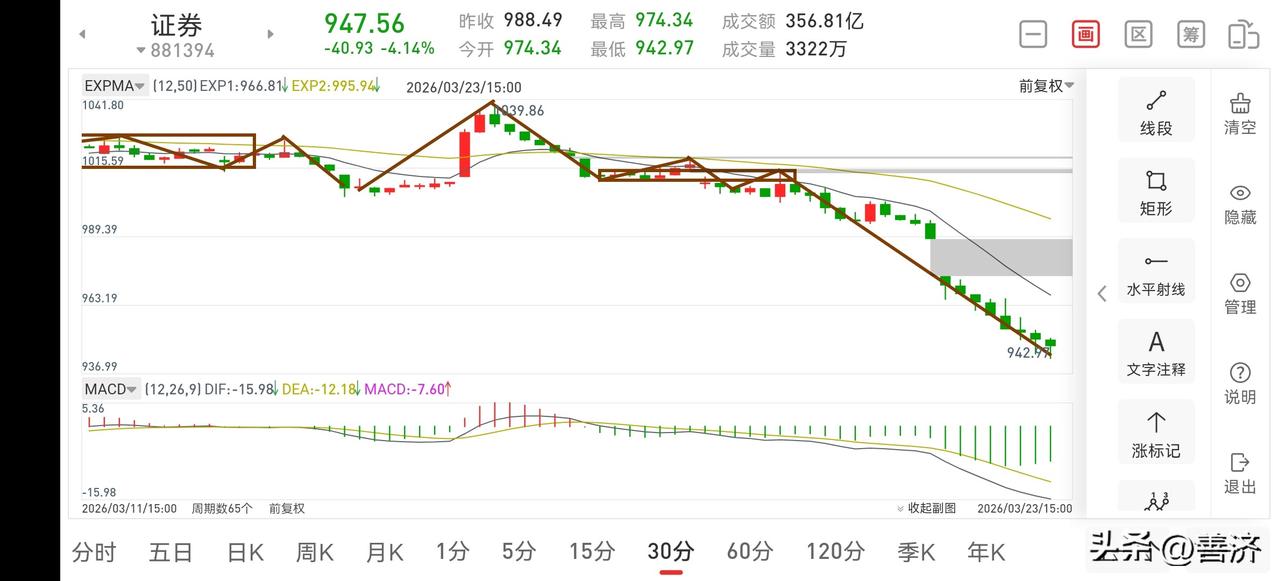 证券板块复盘(2026.3.23) 今天下午还是延续了一个下跌,但跌幅有所减缓,即便如此,目前还是有下跌空间的,操作上不宜操之过急。 1.从30分钟图一上看,下午并没有构建第二个30分钟中枢,所以此段下跌并不能判断为结束,仍需继续观察,目前成交量在日线上已出现T量柱,说明此处是有少量割肉盘出来的,但还没有恐慌盘出来,那么后面估计还得在时间上去磨了,所以在操作上不宜急着加仓。 2.从5分钟图二上看,目前已经完成了三个5分钟中枢的构建,并且绿柱急剧萎缩,红白线也已出现底背离,那么明天技术上是有反弹需求的,但今天下跌太强,反弹高度有限,此处的反弹目的只有一个,就是构建第二个30分钟中枢,待构建完成后还有一个下探过程,所以回补仓位还得继续等待。 3.今天的下跌居然没见恐慌盘出来,有点失望了,预计后面只能靠时间去磨了,并不会立马出现反转的情况。我要上精选-全民写作大赛 券商策略解读 证券股如何