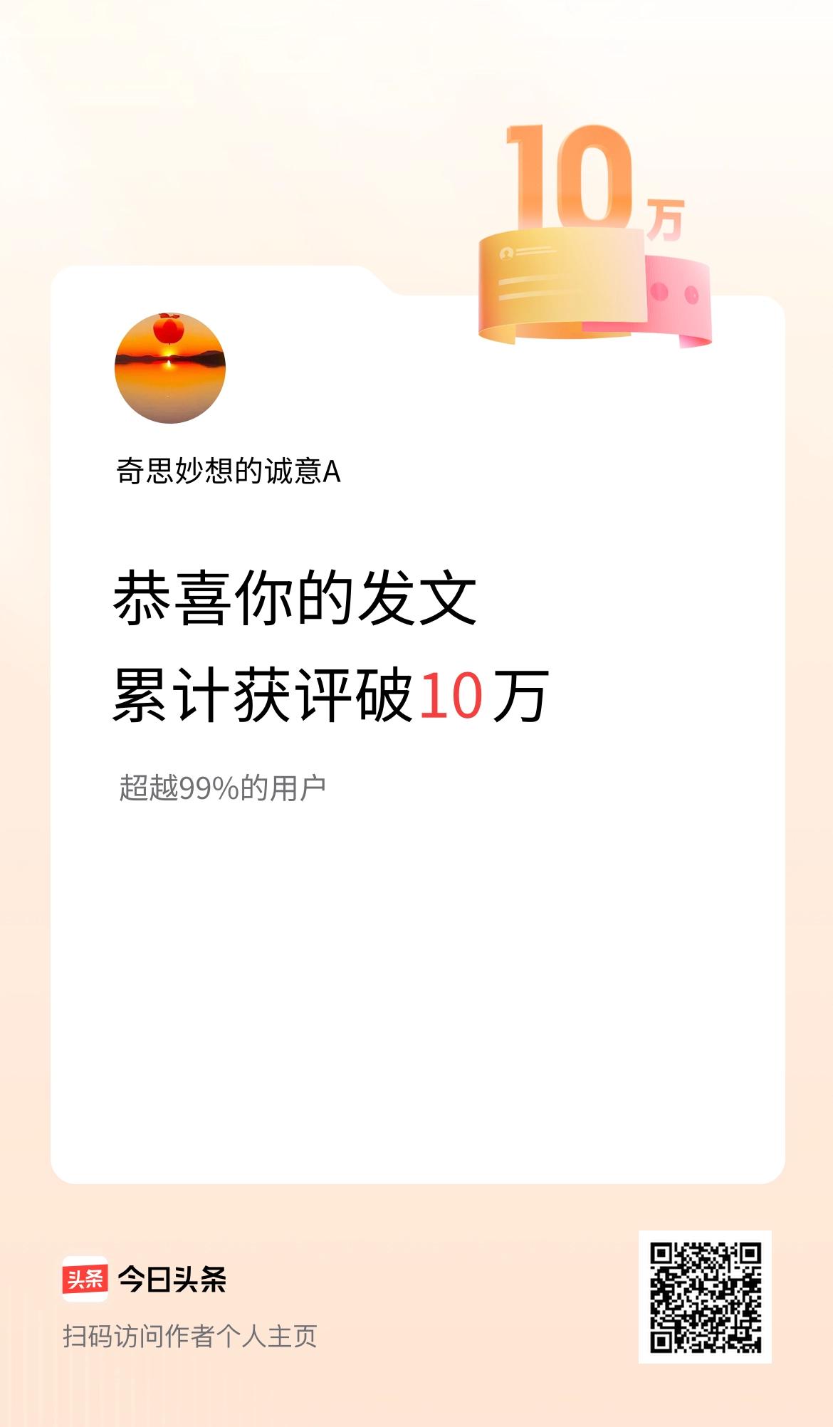 我在头条累计获评论量破10万啦!