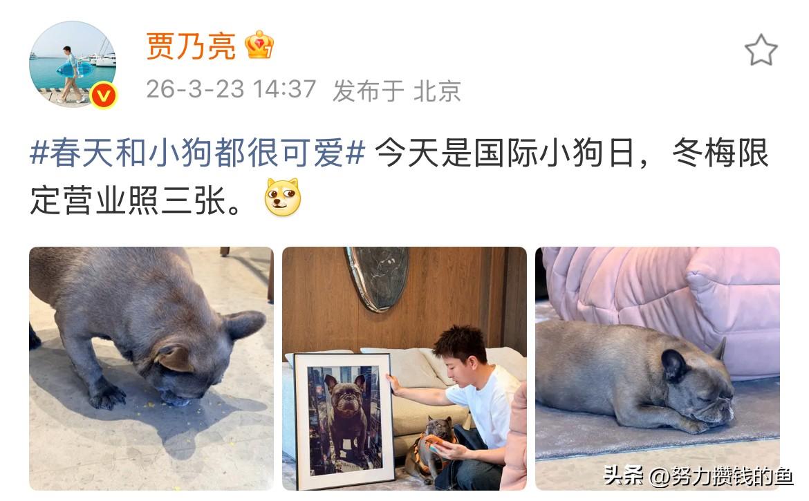 贾乃亮,晒狗狗照片; 3月23日,贾乃亮在社交平台更新一组照片,这次不是家人,而是三张狗狗的照片; 贾乃亮说: 今天是国际小狗日,冬梅限定营业照三张。[吐舌] 照片中的狗狗,不是在吃东西,就是在睡觉;贾乃亮还专门给狗狗拍了一张照片,还做了相框,看得出来,他是真的很喜欢他的狗狗; 网友们看到后,纷纷留言: 冬梅营业照太可爱了,小狗和春天最配 毛孩子超可爱的,谁会不喜欢呢 不止今天,希望每天都要对可爱的狗狗很好很好哦