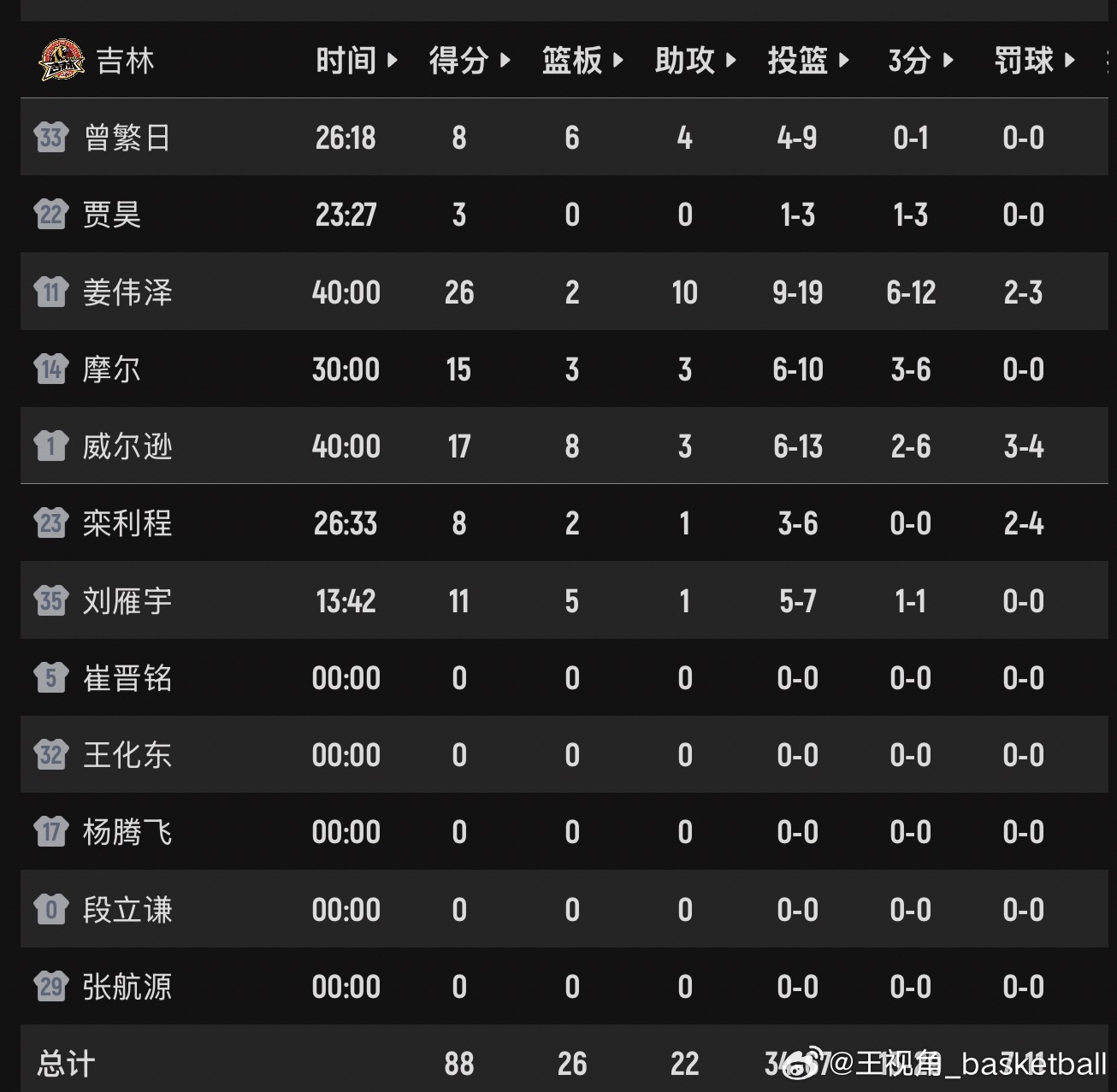 7人轮换制的吉林男篮88比86战胜10人轮换的北京男篮,看着北京男篮的出色的数据表格,我深深陷入沉思,这到底怎么输的吉林男篮vs北京男篮