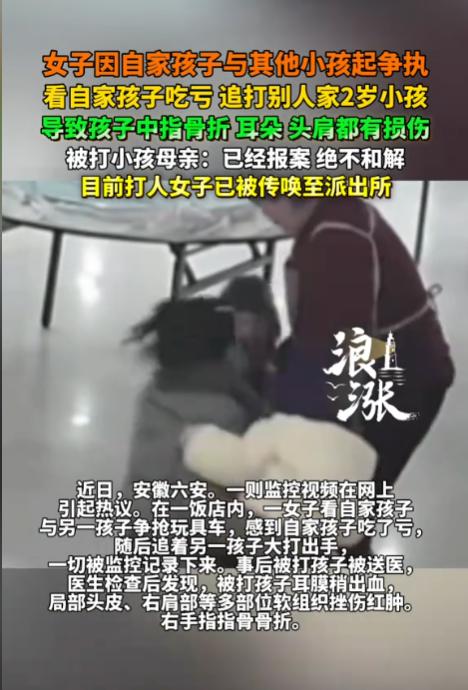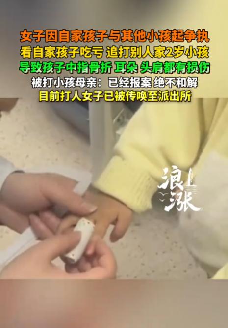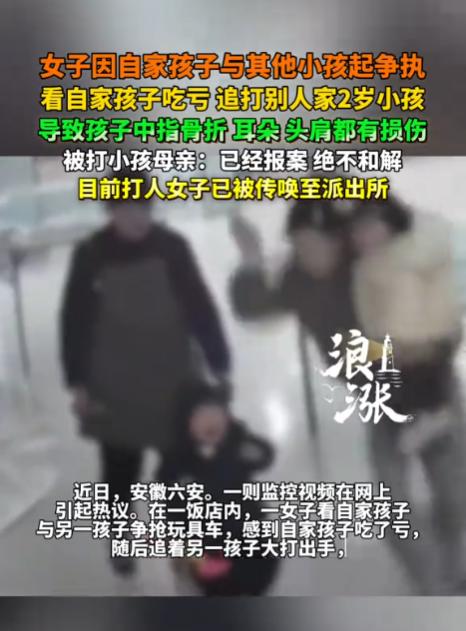 “小孩子之间闹矛盾,大人别瞎掺和!”安徽六安,一2岁小女娃在玩玩具时,遭到另一2岁小孩强抢,女娃忍不住抓了对方一下,谁知竟遭到对方母亲连续扇耳光以及打手,致女娃中指骨折、耳膜出血。目前,女娃母亲已报案,并表示绝不和解。目前,打人女子已被警方传唤。 据悉,2岁小女娃当时是在自家的饭店内玩耍,玩的是自己的玩具。不多时,一名女子带着她2岁的孩子进店用餐。 女子的孩子看到小女娃的玩具车后也想玩,就直接走过去一起玩了起来。谁知二人玩得好好的,突然女子的孩子就要抢小女孩的玩具车。 小女孩不让,二人就这样互相掐了起来。期间,小女孩伸手抓了一下女子的孩子,脸上抓出了一道红印子。 女子听到自己孩子的哭闹声后,立即赶来查看。当她看到孩子脸上的红印子时,情绪一下失控,直接朝着小女孩冲了过去,抬手就对着小女娃的手狠狠扇了一下。 清脆的响声过后,便是小女娃撕心裂肺的哭喊声。店员当时看见后并没有说什么,只是检查了下小女娃的手。 见店员如此不作为,女子地嚣张劲就更大了,直接蹲下身对着小女娃一顿乱揍,脸、头、手,逮着哪里就打哪里,小女孩被打得浑身发抖,蜷缩在地上哭得上气不接下气,嫩生生的身躯很快就肿起大片淤青。 可店员却没有明显的阻止行为,也没有将小女娃拉走,待女子发泄完后,店员才带着小女娃回到了店内。 可谁曾想,女子竟然抱着她的孩子来到了饭店的柜台前,理直气壮地与店老板大声争执,甚至让随行男子给店老板1000块钱做补偿,但拒不道歉。 一开始小女娃的父母都未发现小女娃受伤了,还奇怪为什么孩子一直哭闹,直到去了医院检查,才发现小女娃的中指已经骨折,耳膜还出血了,全身多处有淤青。 看着自家女儿的伤情,作为父亲的店老板气得直接报了警,且拒绝和解。 目前,打人女子已经被警方传唤。 有不少人表示,打这么严重怎么是行政拘留?这难道不是故意伤害罪? 还有人表示,这个店员没必要留了,不是说要她和女子打架,至少自己老板的孩子应该护着。 从网传视频来看,女子的行为确实有些过了,她自己的孩子与小女娃都才2岁,2岁的孩子哪能如此轻松控制自己的情绪? 更何况,是女子的孩子去抢人家玩具玩,女子没有管教好自己的孩子,却趾高气昂地对一个2岁的小女娃大打出手,真的是太丢脸了。 《治安管理处罚法》第51条第2款第2项规定,殴打、伤害不满14周岁的未成年人,处10~15日拘留,并处500元~1000元罚款。 女子如此恶劣的行为,且都把小女娃打骨折了,这行政拘留的期限并不会太低。 至于有人认为应当以故意伤害罪处理,这就需要伤情达到轻伤以上才行。 按照《人体损伤程度鉴定标准》的规定,手功能丧失累计达一手功能4%;除拇指外的一个指节离断或者缺失;两节指骨线性骨折或者一节指骨粉碎性骨折(不含第2至5指末节)则构成轻伤二级。 这样来看,小女娃的伤情尚未达到可以刑事处罚的程度。 不过,此事还没算完,由于女子的侵权行为给小女娃不仅造成了身体上的损伤,同时也造成了心理上的创伤,所以女子应当赔偿小女娃医疗费、精神损失费等费用。 最后,冲动是魔鬼。这件事本用一句道歉、一次安抚即可轻松化解,可这名女子作为成年人,却偏偏冲动行事,故意升级矛盾,所以等待她的就是法律的严惩,而且还可能要承受网友们的谴责。 大家对此事怎么看?欢迎留言交流。