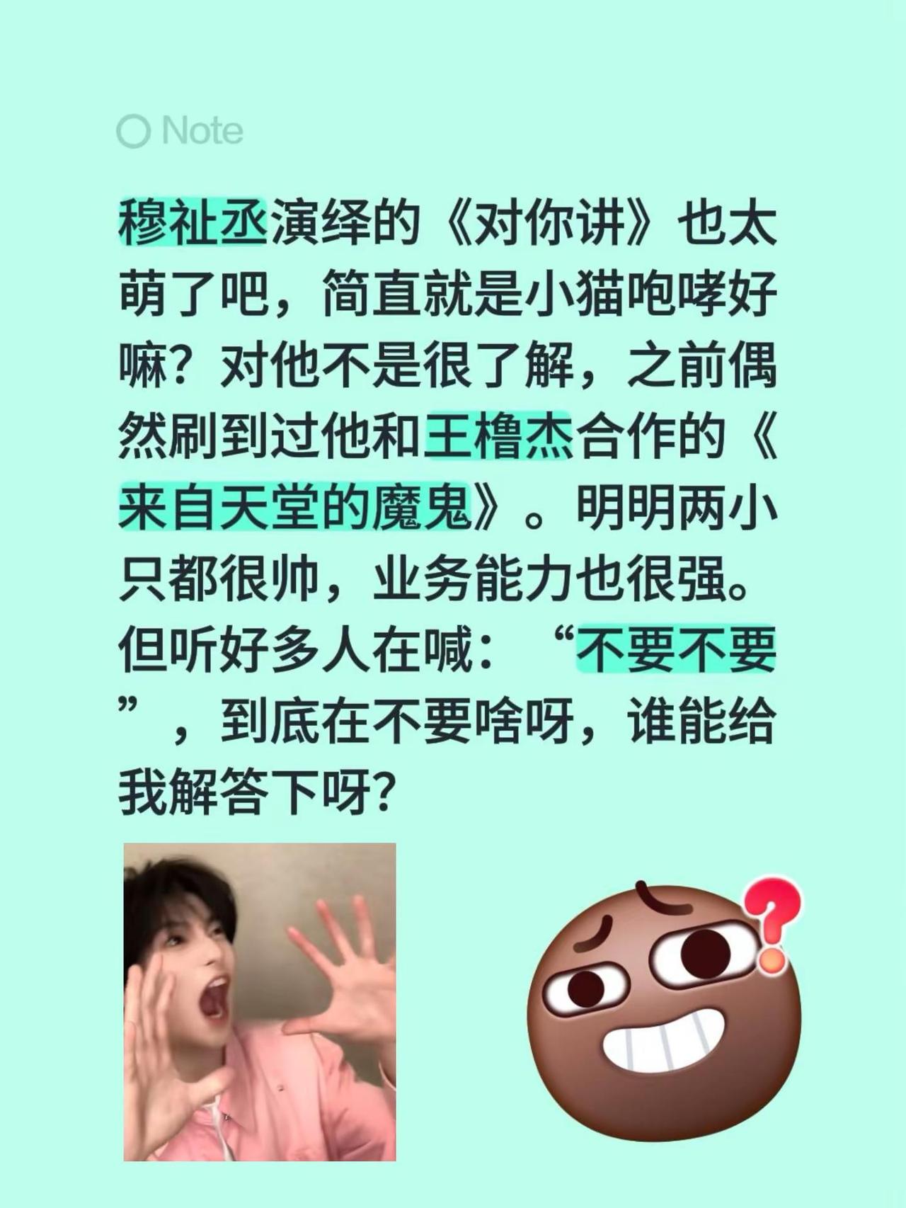 穆祉丞豚之萌兔!穆祉丞演绎的《对你讲》也太萌了吧,简直就是小猫咆哮好嘛?对他不是很了解,之前偶然刷到过他和王橹杰合作的《来自天堂的魔鬼》。明明两小只都很帅,业务能力也很强。但听好多人在喊:“不要不要”,到底在不要啥呀,谁能给我解答下呀?穆祉丞 穆祉丞好萌的对你讲
