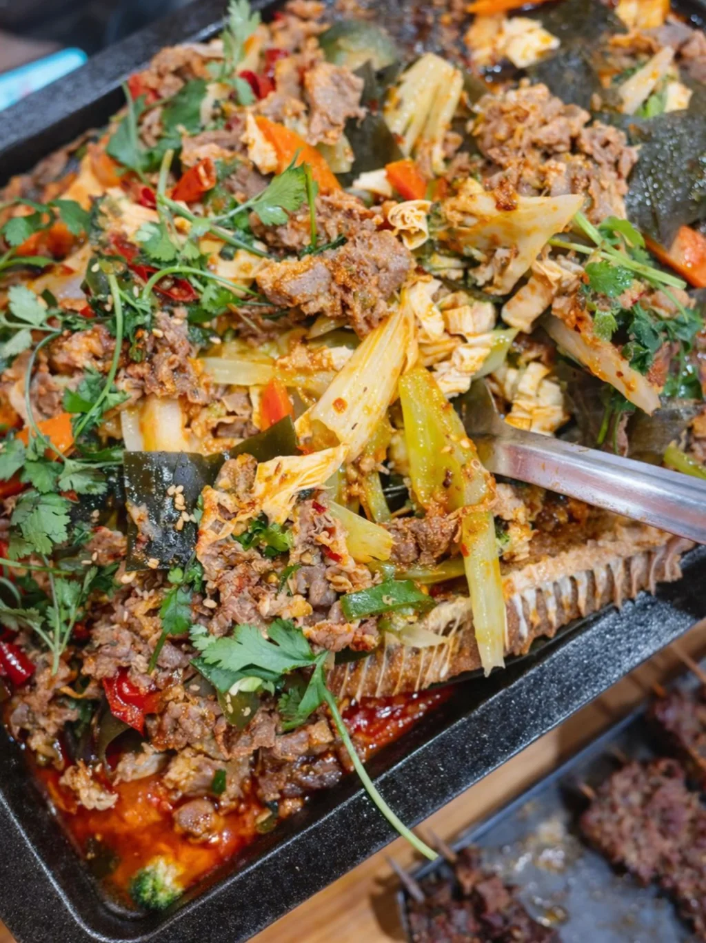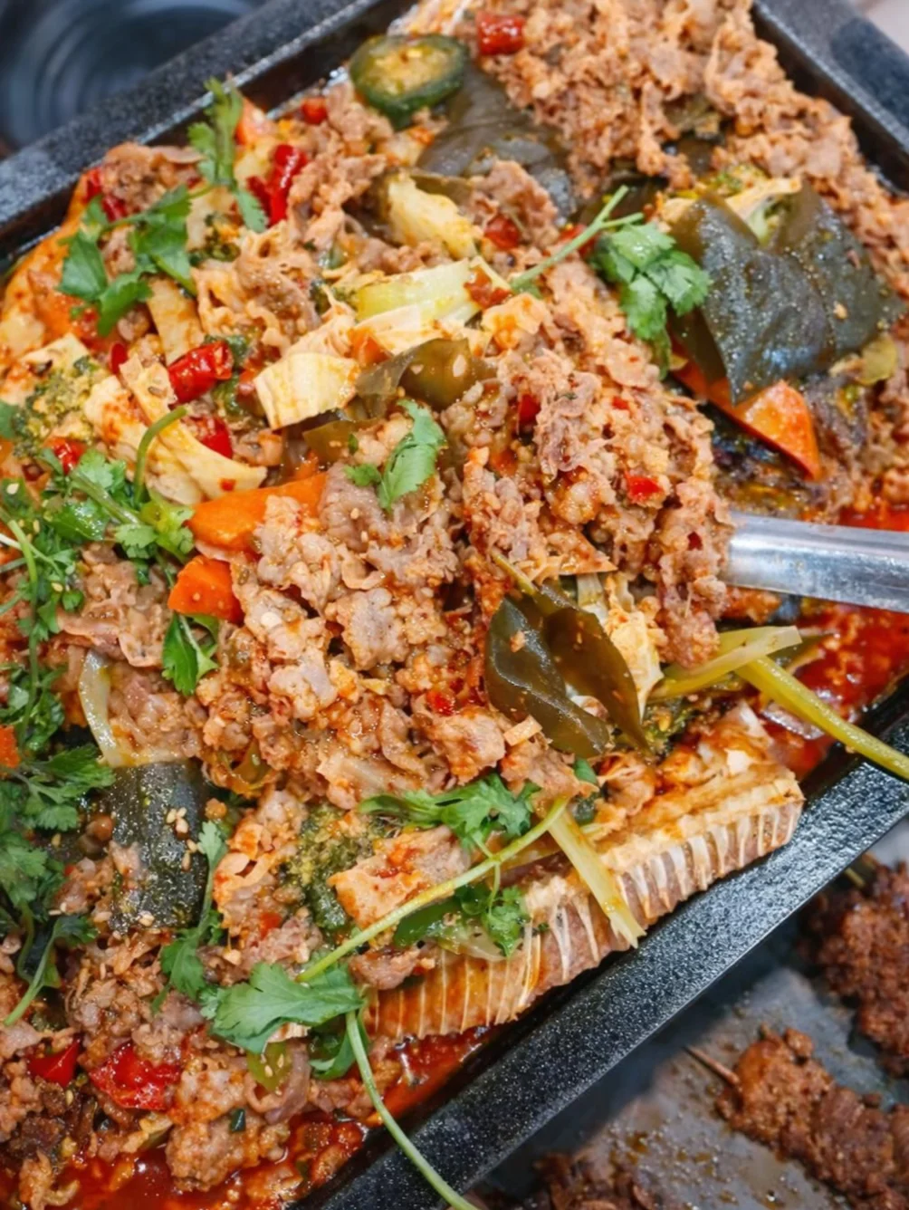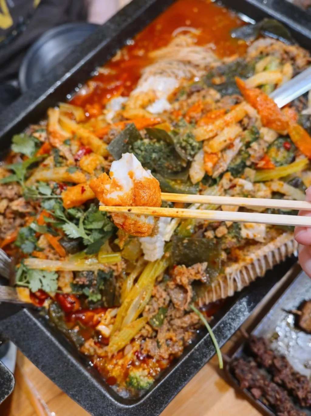 烤鱼分量超大,满满一盘,我觉得够3-4人吃。上面铺着超厚肥牛,吸饱汤汁巨香,下面的鱼刺很少,可以放心大口炫。配菜和酱汁才是灵魂所在,金针菇和西兰花配着汤汁绝了!原价要119.99,现在便宜30🔪,性价比拉满