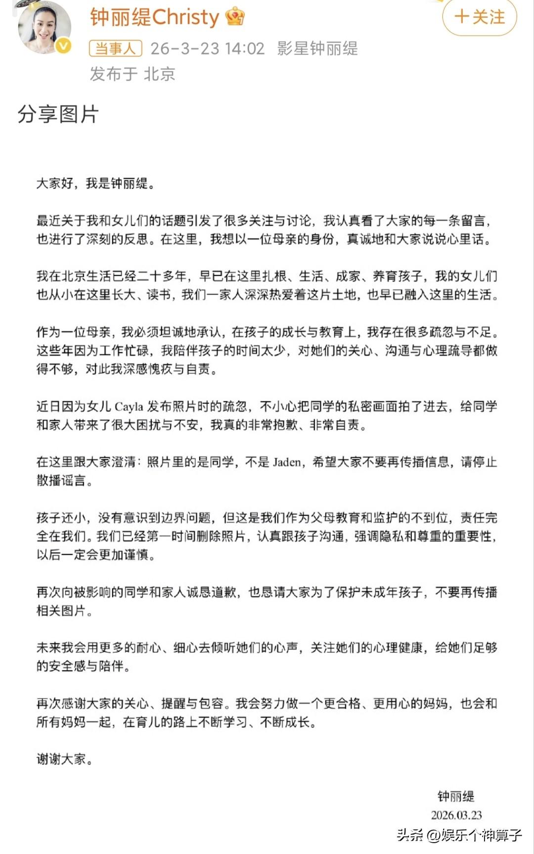 钟丽缇,深刻反思! 3月23日,演员钟丽缇在社交平台发文,回应女儿考拉晒照争议,坦言认真看了大家的每一条留言,已经进行深刻反思,作为母亲,也感到愧疚与自责。 事情的起因,女儿考拉在社交平台晒出一张与好友的自拍照,没想到,照片中,出现了一个女孩坐在马桶上的画面(网友认为是姐姐Jaden),纷纷指责其不顾别人的隐私,自己却知道遮挡。 钟丽缇直接澄清,坐在马桶上的女孩并不是 Jaden,而是考拉的同学,第一时间与孩子沟通,删除照片,并诚恳道歉。 别的不说,钟丽缇的态度,值得让人称赞,女儿的做法引发争议,第一时间出来解释,大方承认对孩子监护不到位。 当然,有些网友对于钟丽缇的回应并不满意,认为即便画面中出现的是同学,也不应该随便泄露隐私。 说实话,16岁的考拉,可能考虑的没那么全面,还不至于故意这样做,爱美之心人皆有之,也可以理解。 如果能够吸取教训,下次做事更加谨慎,大家也没必要太较真。 另外,钟丽缇没有坐视不理,而是耐心的说明情况,为了女儿,放低姿态,可怜天下父母心,希望大家多一些包容和理解。 对于考拉而言,这次经历,也是一次成长中的考验,有则改之无则加勉,以后做事要更加的谨慎。