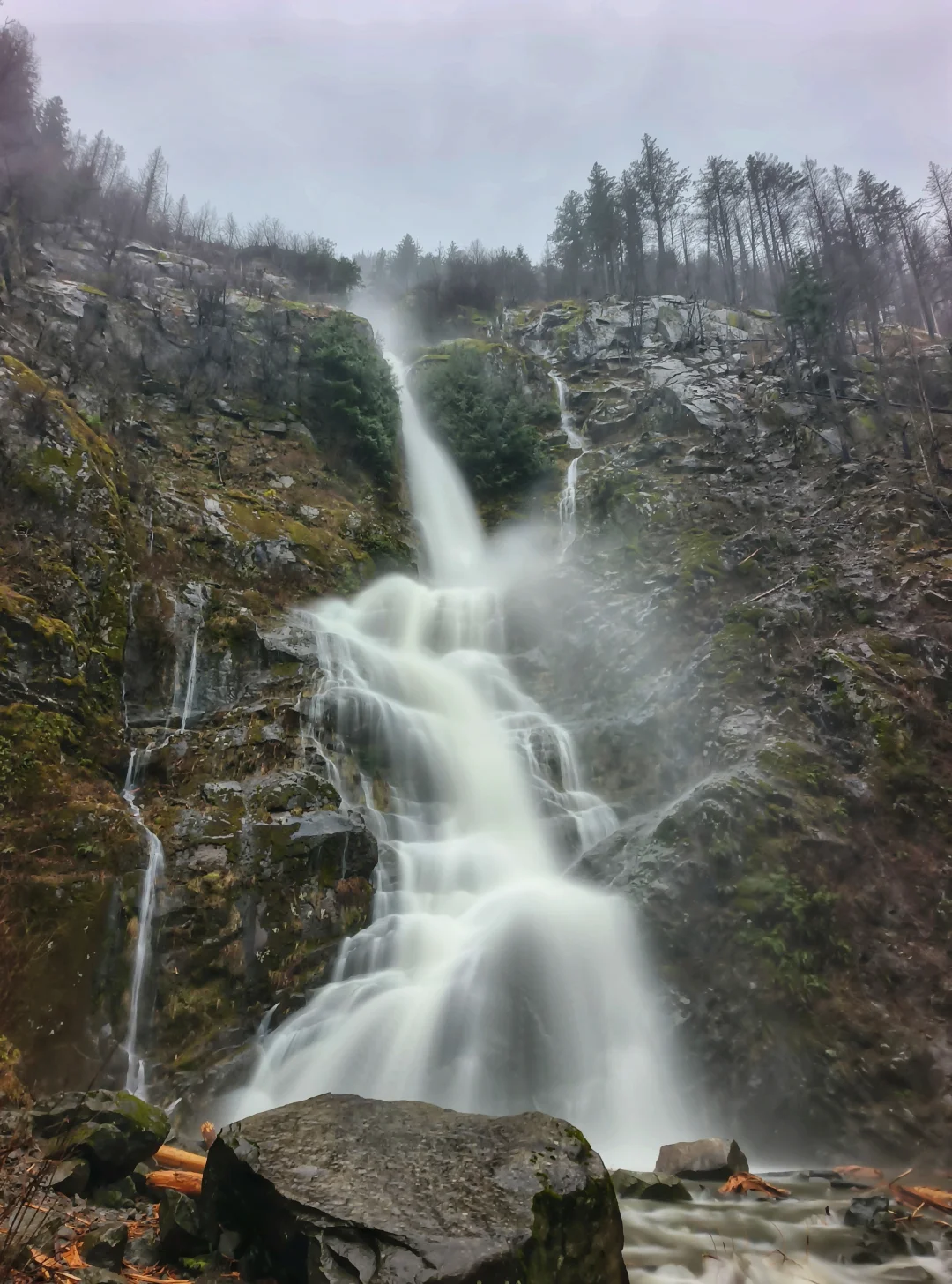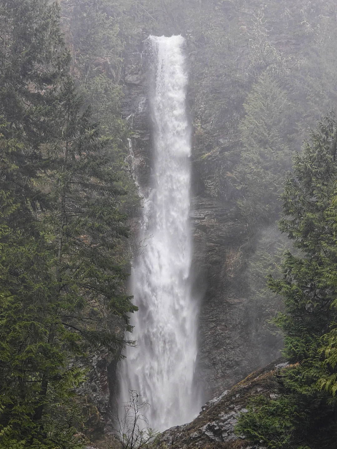 第三日归程顺路去了Hope附近的Flood Falls,去年夏天曾路过此处,当时水流涓细,我们极度好奇,这如何当得起Flood的名号?这次再看,水势汹涌,一路咆哮而下,当真名副其实。更为壮观的是,远眺山崖之上竟有七八条瀑布齐泻而下,殊为震撼!