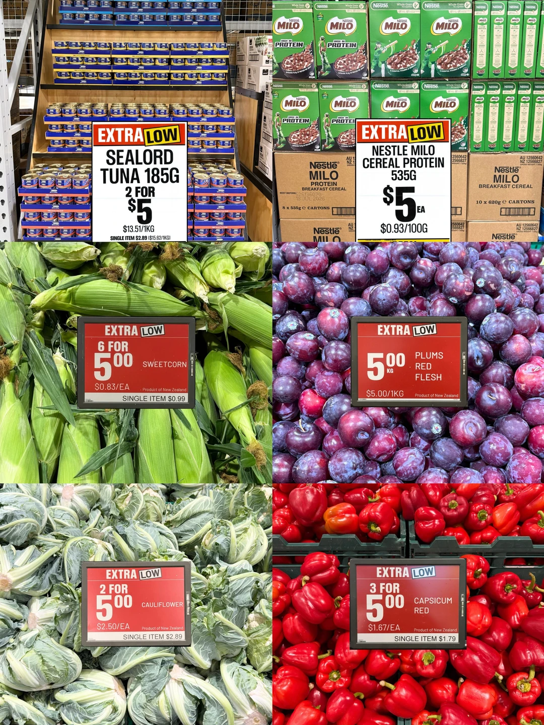 🥦 生鲜区: 甜玉米6根$5、彩椒3个$5、紫色李子$5/kg、花椰菜2个$5、鸡大腿$5/kg