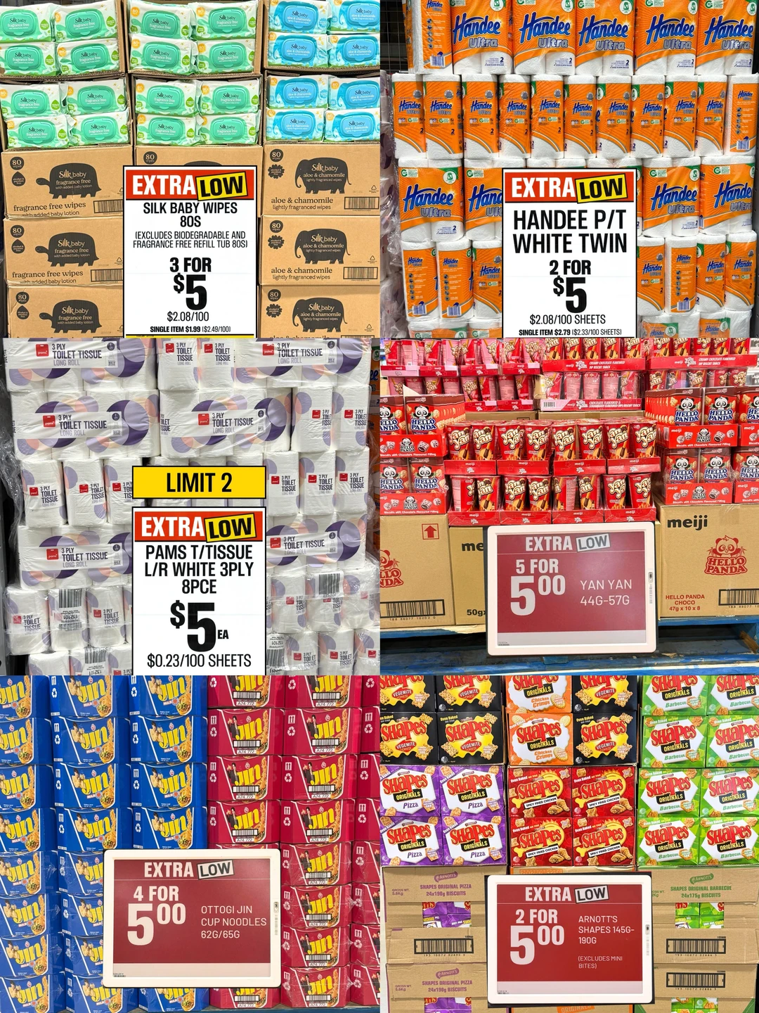 🧻 日用品: 婴儿湿巾3包$5、纸巾2提$5、卫生纸$5/卷