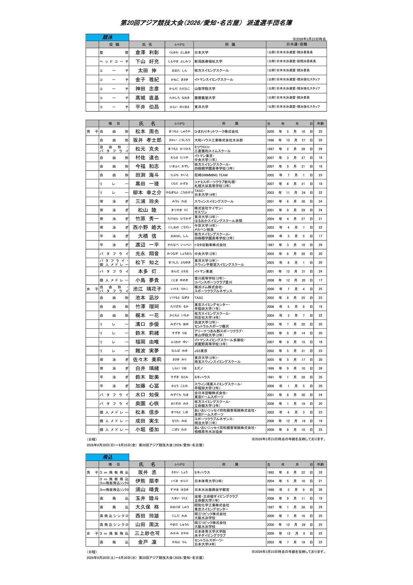 根据日本游泳选拔赛(3.19-3.22)结果,日本泳协于今日公布2026年名古屋亚运会参赛运动员名单,详细名单与成绩如下图所示,包含单独接力选手。