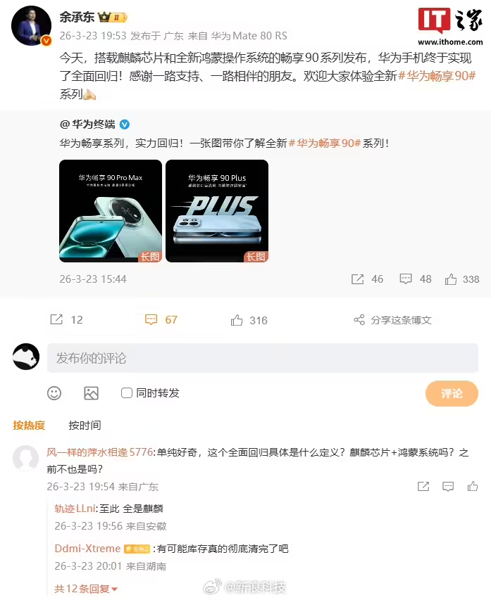 余承东虽然身体不适,但刚刚还是发文谈及了华为手机的回归:“今天,搭载麒麟芯片和全新鸿蒙操作系统的畅享 90 系列发布,华为手机终于实现了全面回归!感谢一路支持、一路相伴的朋友。”