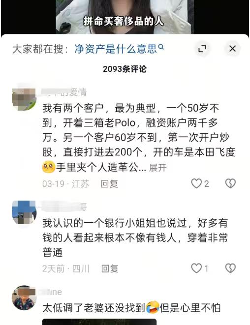 怎么判断一个人是真有钱还是装有钱?最近和一位银行朋友聊天,她的2个说法令人诧异。 她说,那些每天骑着电动车上班、送孩子上学的邻居,存款可能几百万,那些秀豪车车标、穿奢侈品的同学,可能下个月的贷款都没有着落。 她还给了一个“净资产基准线标准”计算公式,年收入*年龄/10=净资产基准线,如果你目前的资产是这个数的两倍,那么你在这个圈子就是真有钱,低于这个数的一半,管你收入高低,都是装有钱。 对于消费习惯,她的观点也戳现实的。那些装有钱的人,更习惯超前消费买奢侈品、豪车,因为他们需要这些外在的东西来标榜自己,打造人设。反而是真有钱的人,对买高价产品反而更严谨,他们无论是赚钱还是守钱的能力都很强。 这里有个误区需要注意,并不是真有钱的人不买贵的东西,他们更倾向于可以买贵的不能买贵了。其实不少有钱人他们都有贵重物品的,只是一般不会原价买,而是等品牌内购会,或者去奥莱、唯品会这类折扣渠道买,花更少的钱完成消费。 想了想,这些例子身边其实还挺多的。邻居大姐,老两口很节俭,不舍得吃喝,就骑车上班,儿子买车直接全款A7L。另一个前同事,开着多年的卡罗拉,车位都不愿意买,路边一停就行,衣服都是折扣店买的,去年买了500万的洋房。 要我说,这可能就是消费观念不一样,有的人讲究及时行乐,你说他装他却能装很多年,有的人则对高端消费祛魅了,生活处处节省,但日子不一定很潇洒。没有谁好或者不好,都是自己的选择,你们身边有这种人吗?