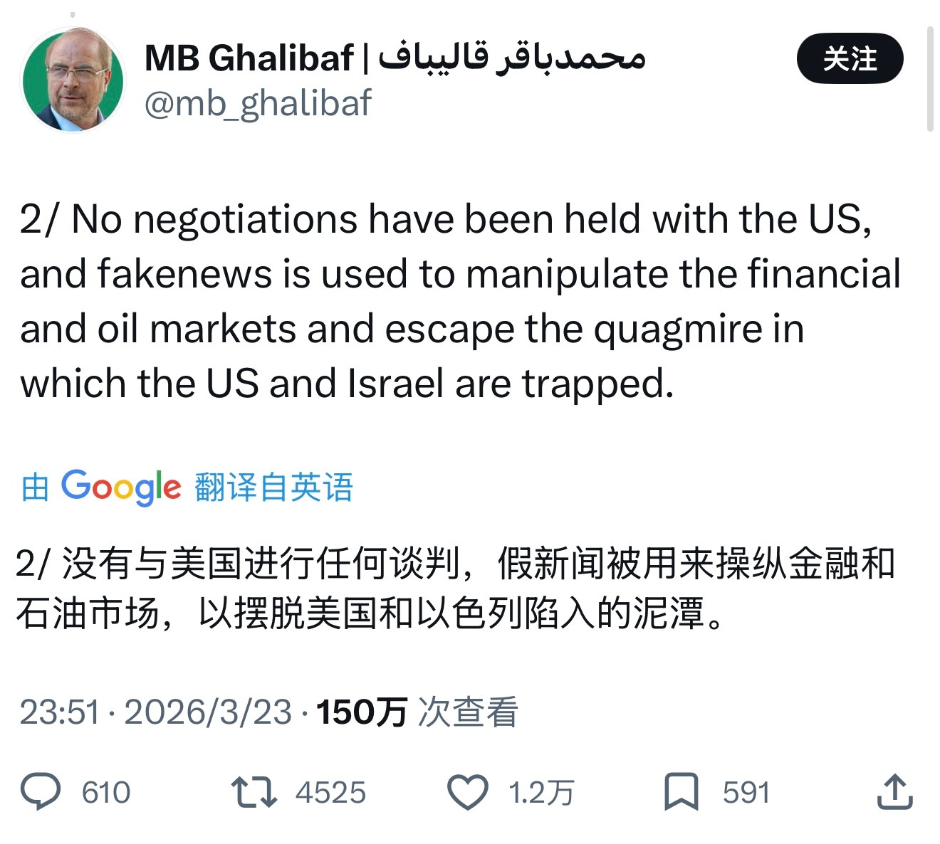 伊朗议会议长穆罕默德·巴格尔·加利巴夫否认与美国进行任何谈判,指出特朗普是在操纵金融和石油市场…