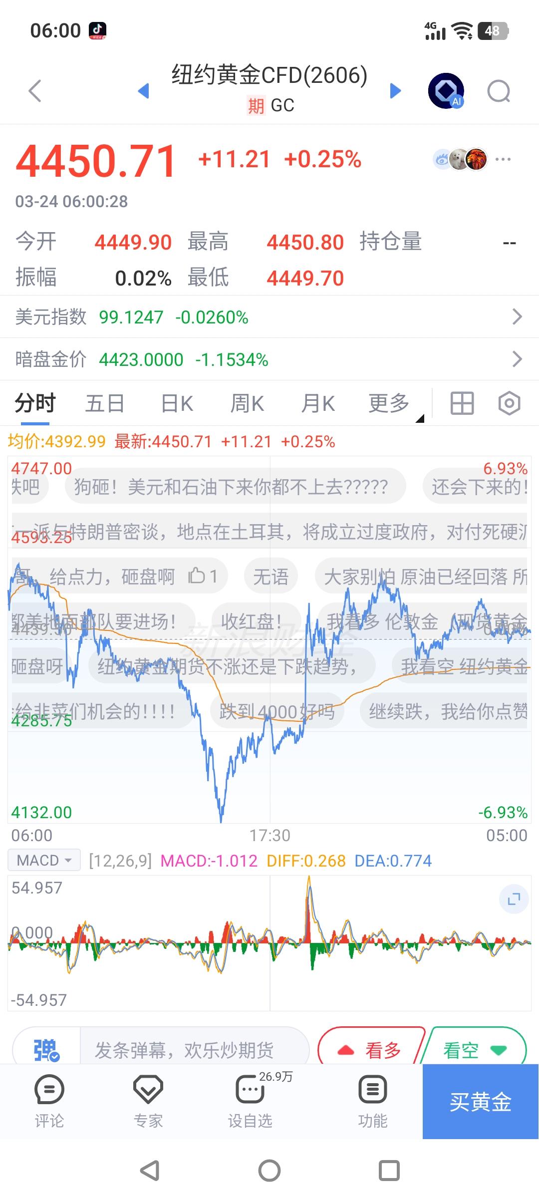 中东战局出现反转? 中东战局已进入第四周,前天美国佬对伊朗发出最后通牒,就在大家都观察美以是否会攻击伊朗的能源设施和电厂时,戏剧性的一幕出现了。白宫主人昨晚在他家的自媒体平台上宣布:过去两天与伊朗进行了“良好且富有成效”的对话,美伊本周还将继续对话,为此,美国决定推迟对伊朗发电厂的打击行动。“我已指示战争部将针对伊朗发电厂及能源基础设施的所有军事打击行动推迟五天,具体情况取决于当下的会议与讨论是否成功。” 消息一出,布油、纽油开始了跳水比赛,短短几分钟便下跌了近十美元;黄金、白银则火箭发射,纽约黄金期货上涨了近400美元/盎司。 不过没高兴多久,伊朗外交部就出面否认与美国进行对话。市场又归于平静。 究竟是怎么回事,到现在全世界还是一头雾水,恐怕只有当事者自己才明白。不管真像如何,美国佬确实需要一个台阶,接下来就看伊朗会不会给这个台阶让美国佬下了!