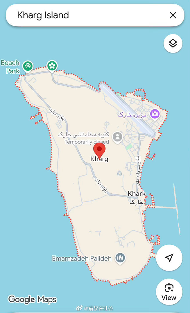 Kharg Island(哈尔克岛)位于波斯湾北部,是伊朗南部布什尔省附近的一个小型珊瑚岛,距离伊朗本土海岸约30公里。它面积仅约20平方公里,却承担着伊朗约90%的原油出口任务,每天有大量油轮在此装载石油,堪称伊朗经济的“心脏”。