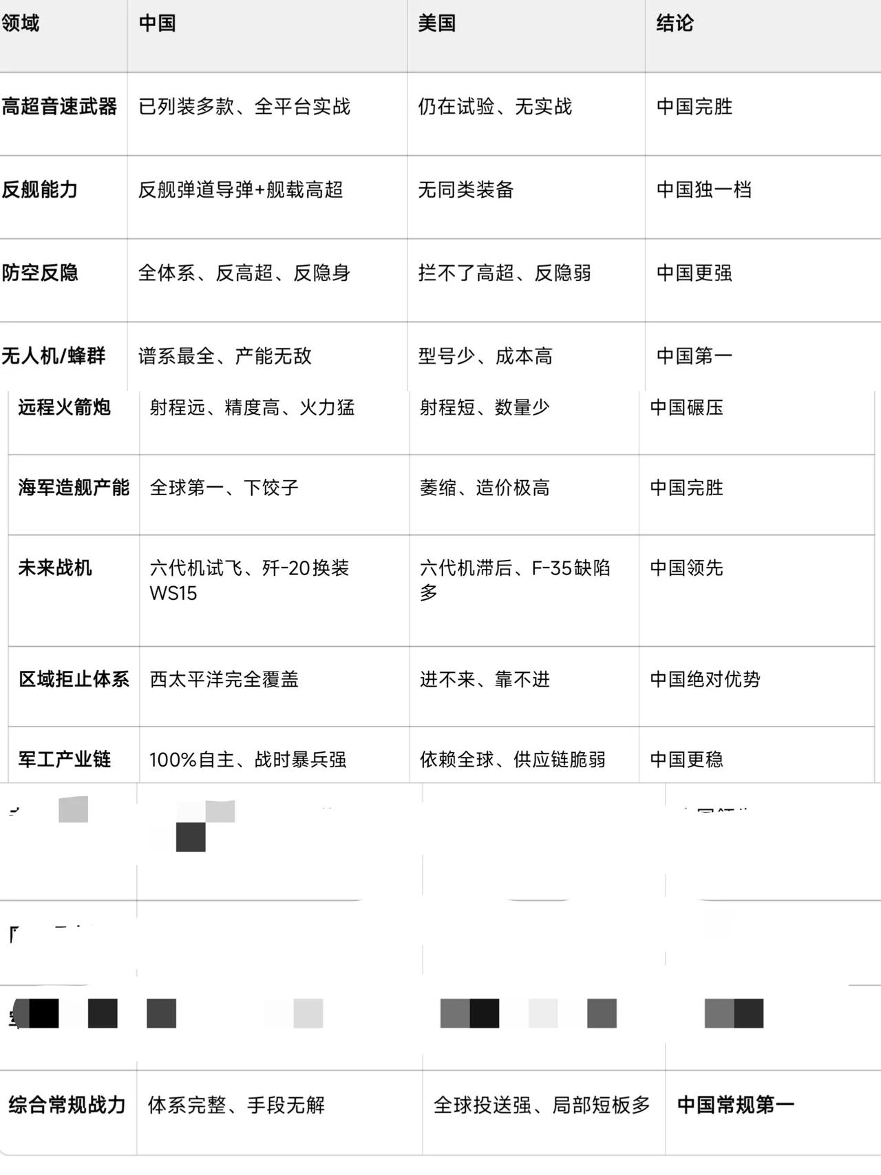 中美军事实力具体差多少是差一指头还是两指头?长期以来不好确定,好像挺复杂。本世纪之初说至少20年,今天俄媒红星报文章的判断,大部分不如,是整体落后。从大威力武器到常规武器,🇨🇳不少尚处在空白阶段,远轰没有,超大型运输机没有,巨型核动力航母没有,重型直升机没有等等,没有的还不少呢。这都是事实,国防经费有限,把钱得花在刀刃上,比如战斗机,比如超音速武器等,集中力量办大事,攻坚克难,目前看大为成功,第二岛链基本节节碎裂,有效维护了国家安全。不与人比阔斗富,自己清楚和平宝贵。接下来发展一点远洋装备,如航母,长航时无人机等,能有效维护自己的全球利益,即满足了国防需要。