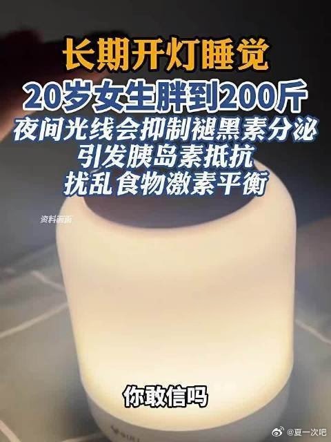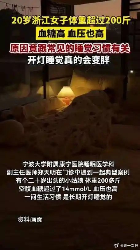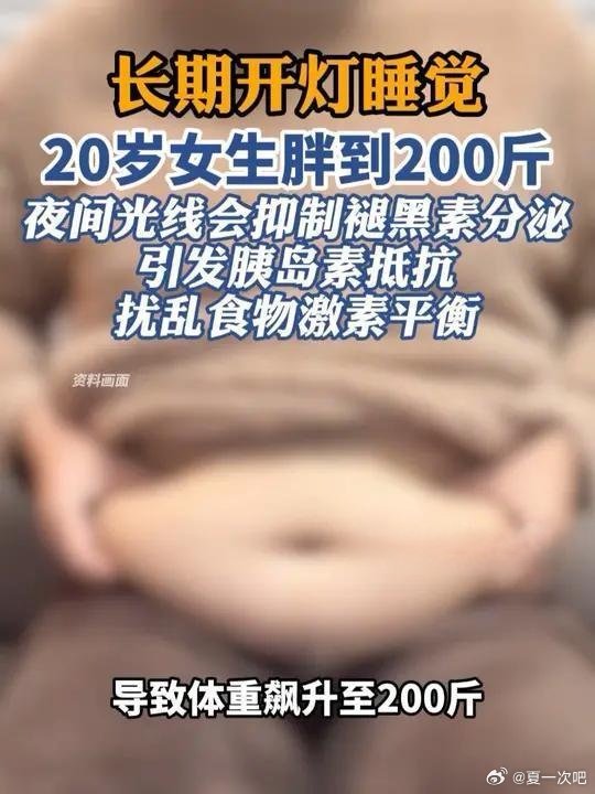20岁女生长期开灯睡觉胖到200斤!近期,浙江宁波一名20岁女性,因长期开灯睡觉,导致体重飙升至200斤,并伴有空腹血糖超标和高血压。医生分析,夜间光线会干扰褪黑素分泌,打乱睡眠节律,影响代谢。研究显示,开灯睡觉的女性体重增加5公斤以上的风险升高17%。