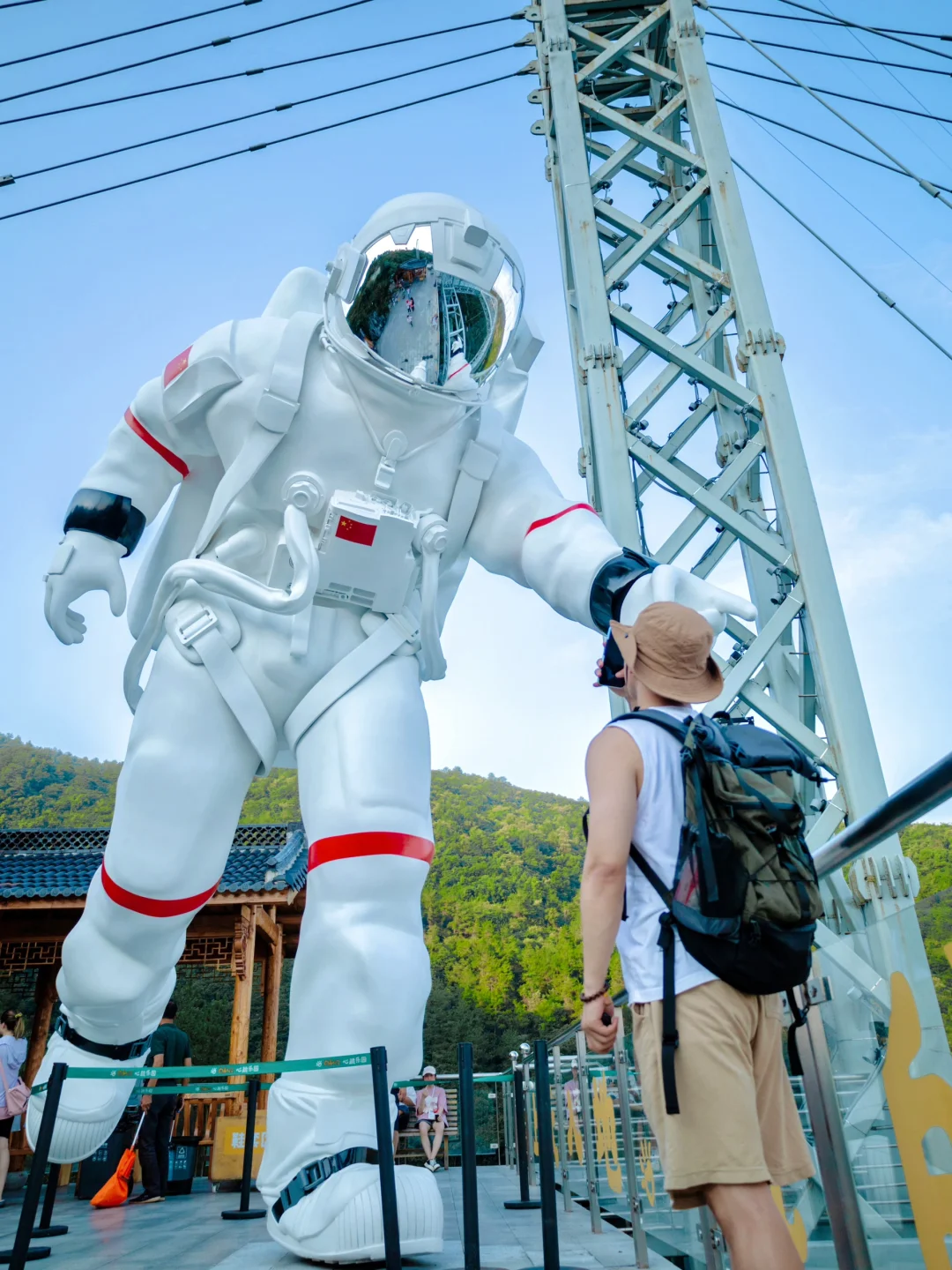 这几个项目都是集中在一起,买一杯咖啡跟巨型航天员合影;做一次长空秋千,冲上云霄感受心跳;最后走到九天云廊的尽头,欣赏一场绝美的山谷日落。