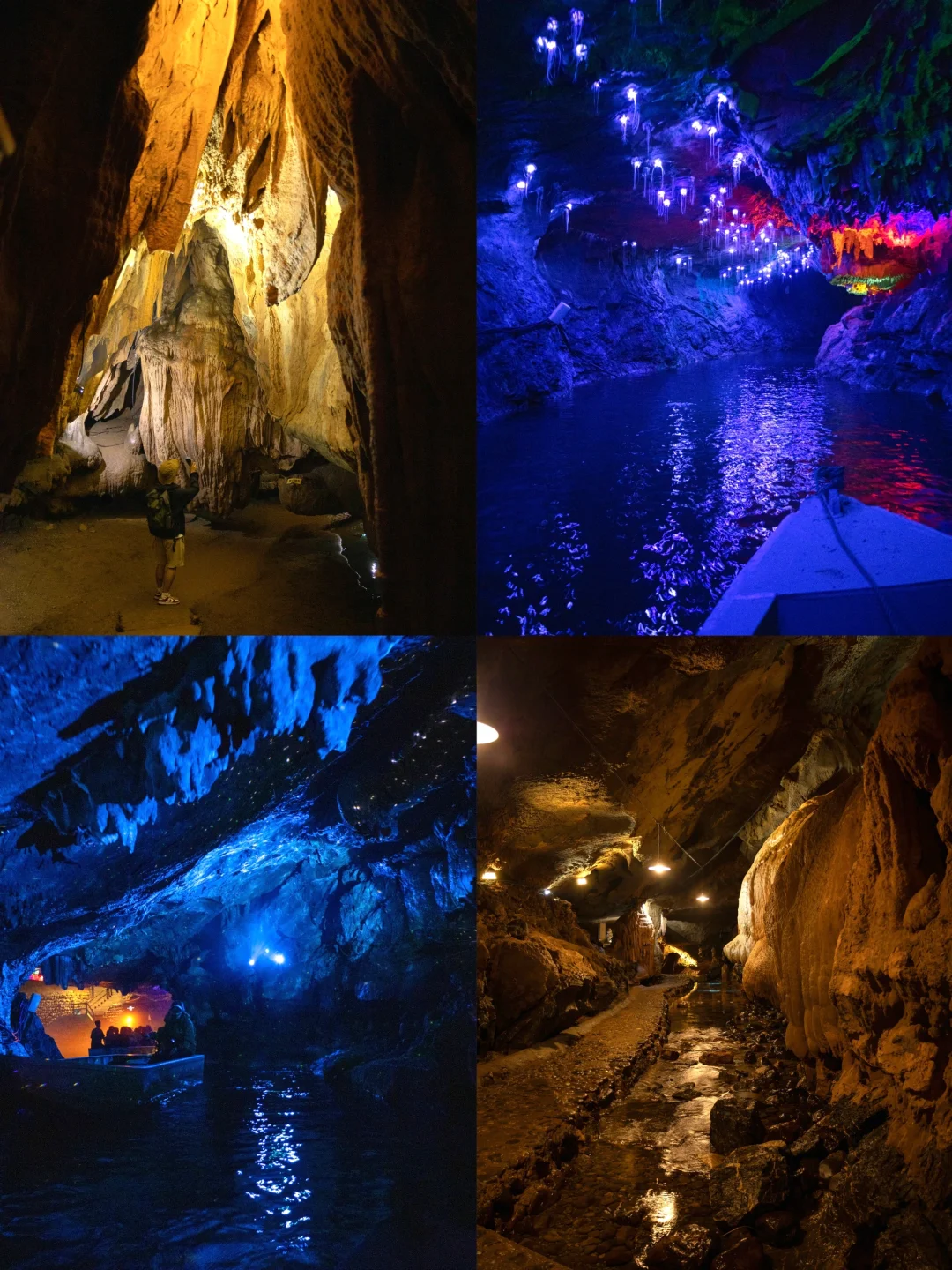 坐船从地下暗河穿越溶洞,洞内恒温18℃,夏天避暑超合适。结合彩色灯光秀展现了大自然的鬼斧神工。