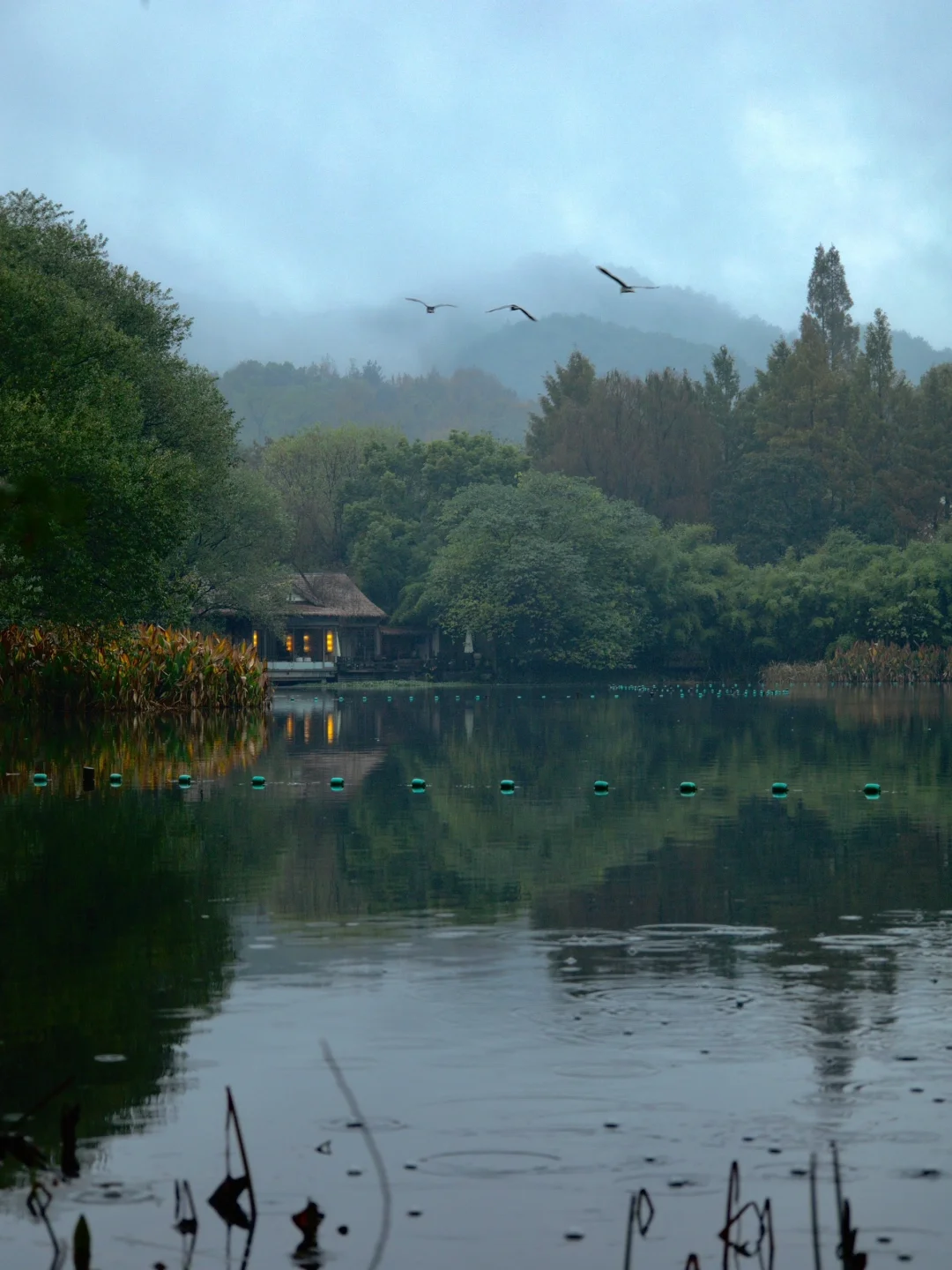 推荐雨天来,远处茅草屋的暖灯在朦胧中点亮,如诗如画,用“远山如黛,近水含烟”形容这里最合适不过。